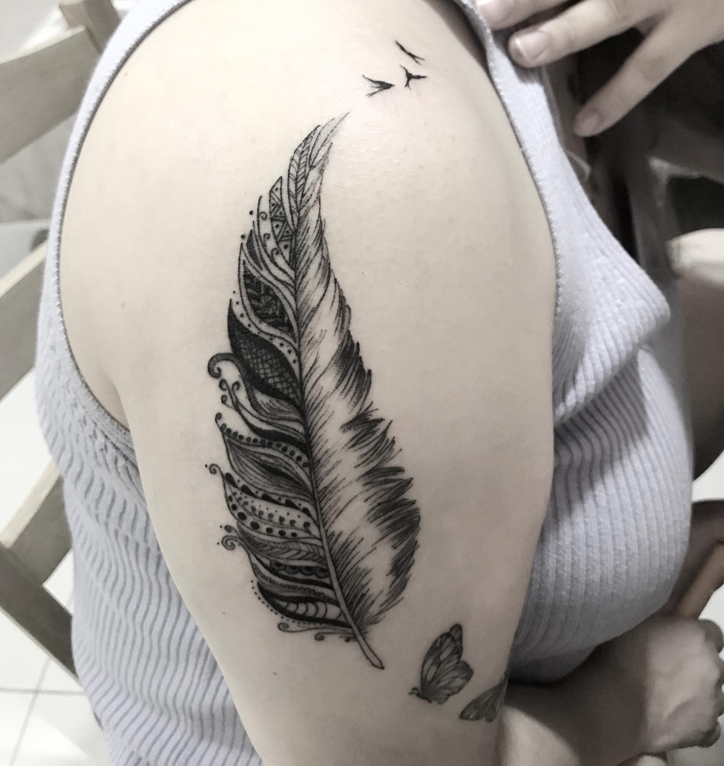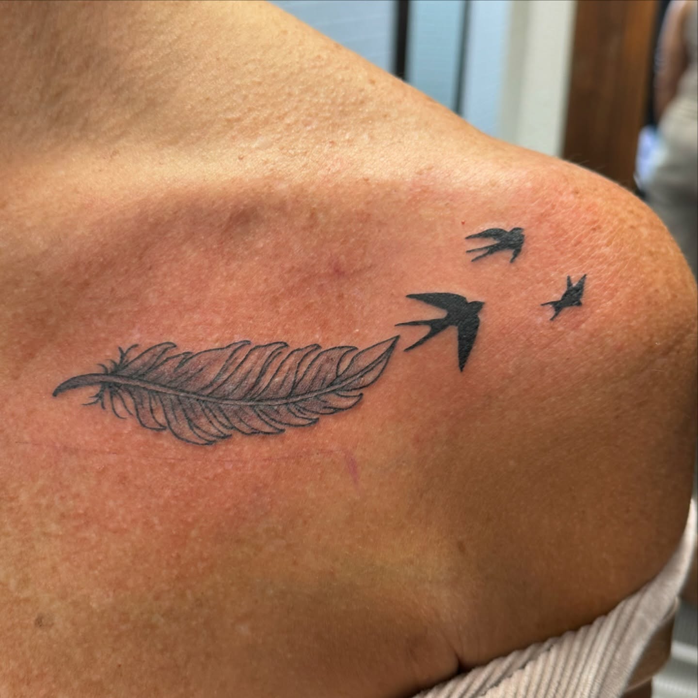 A detailed feather design flows gracefully across the shoulder, accompanied by small birds in flight.