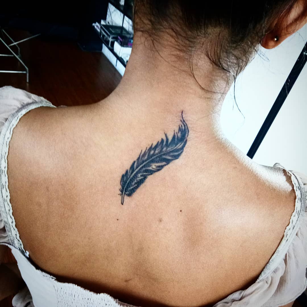 A finely detailed feather tattoo rests gracefully on the back of the neck.