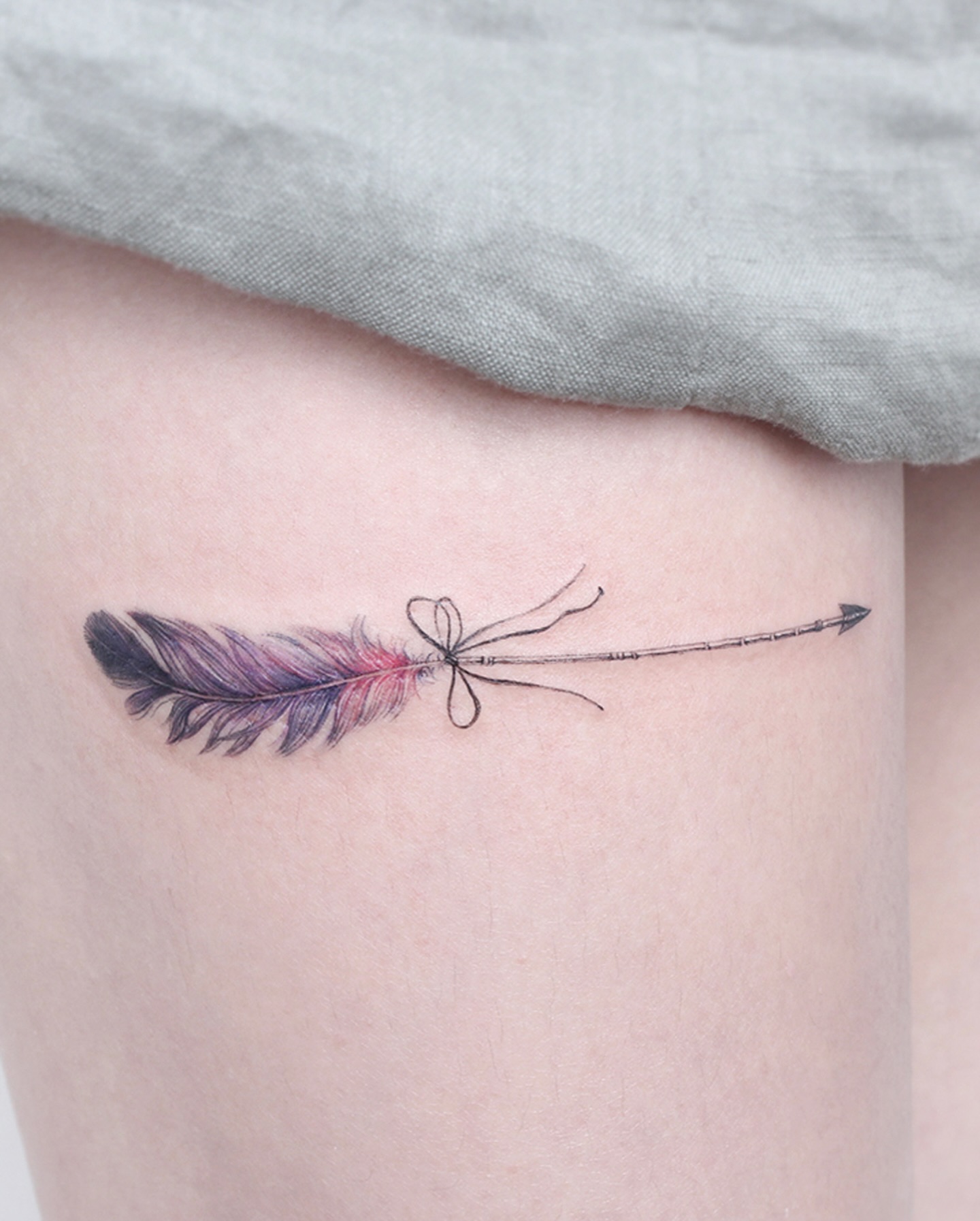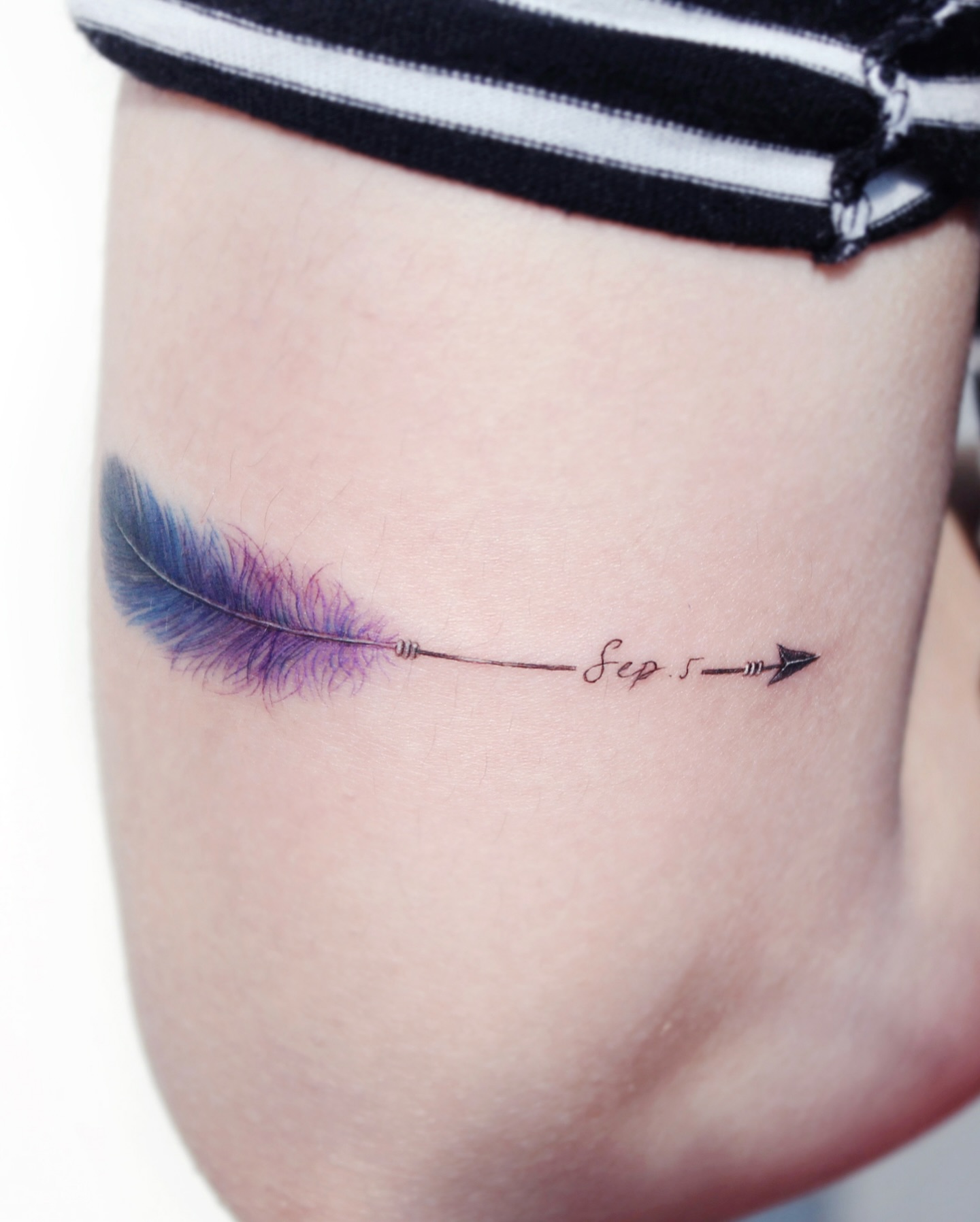The tattoo features a vibrant feather transitioning from blue to purple, elegantly leading into a precise arrow design.