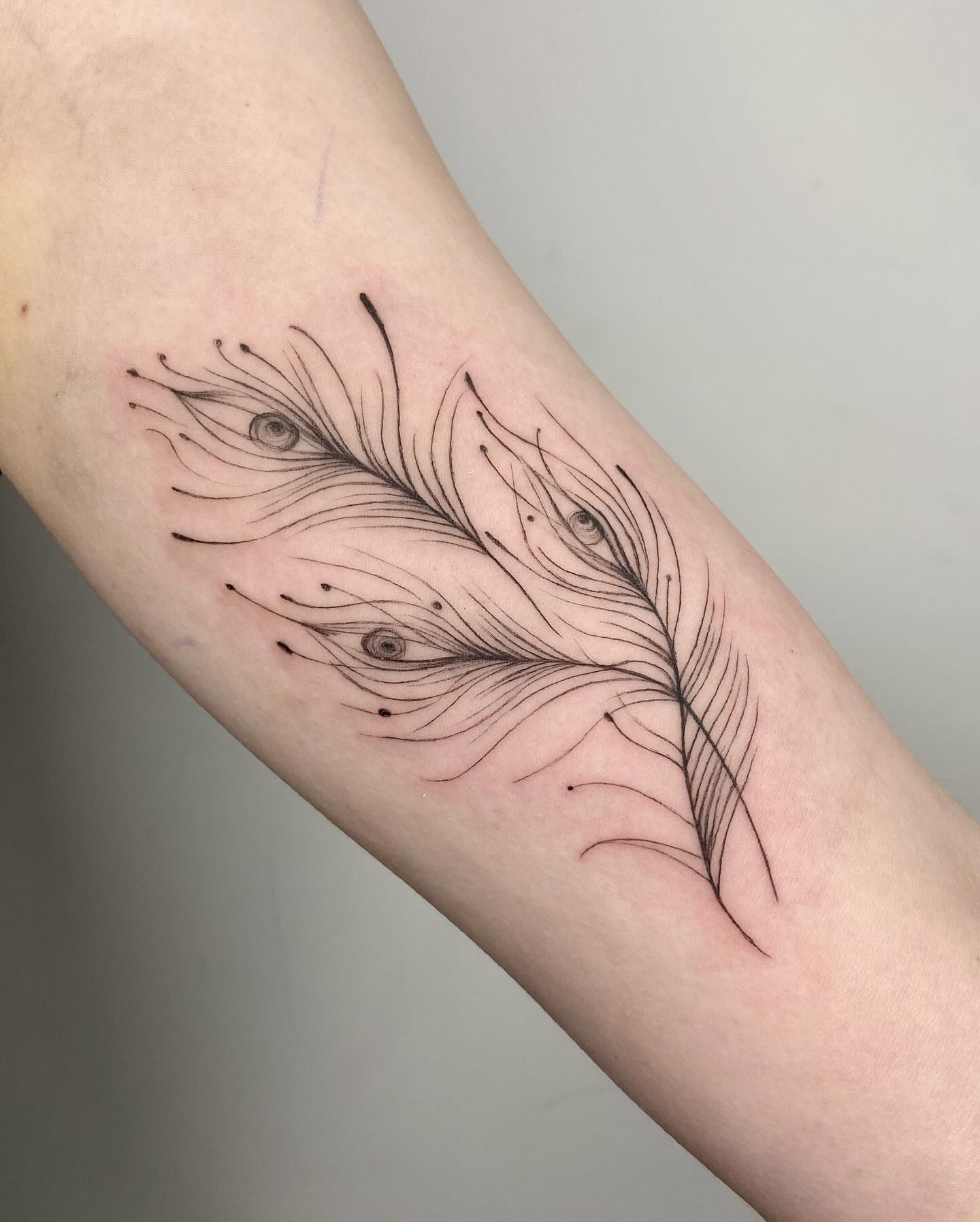 The tattoo features a delicate feather with intricate lines and subtle eye motifs that draw attention.