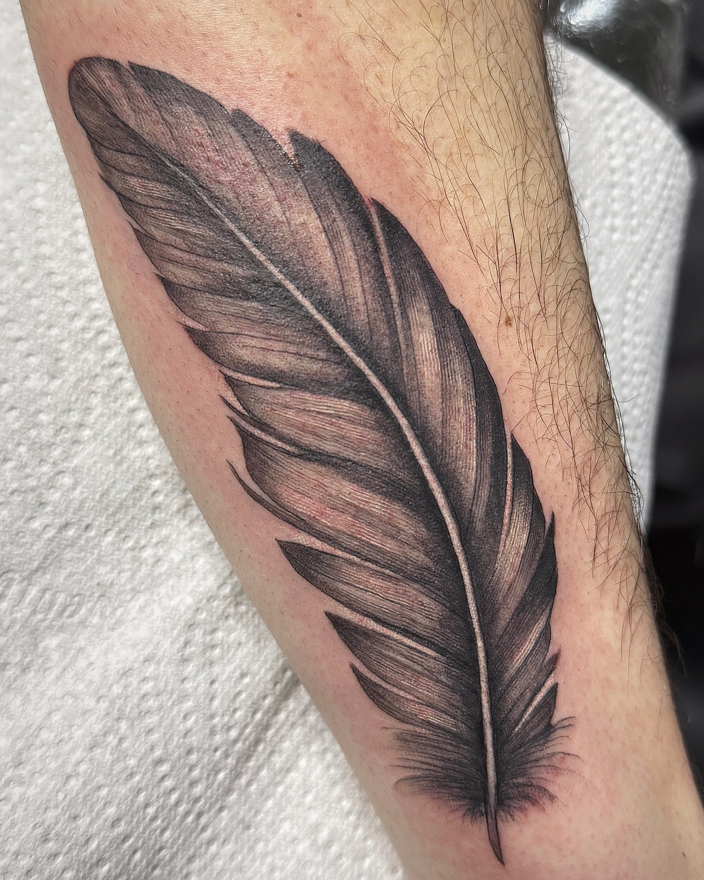 The tattoo features a highly detailed feather, showcasing intricate lines and shading that create a lifelike appearance.