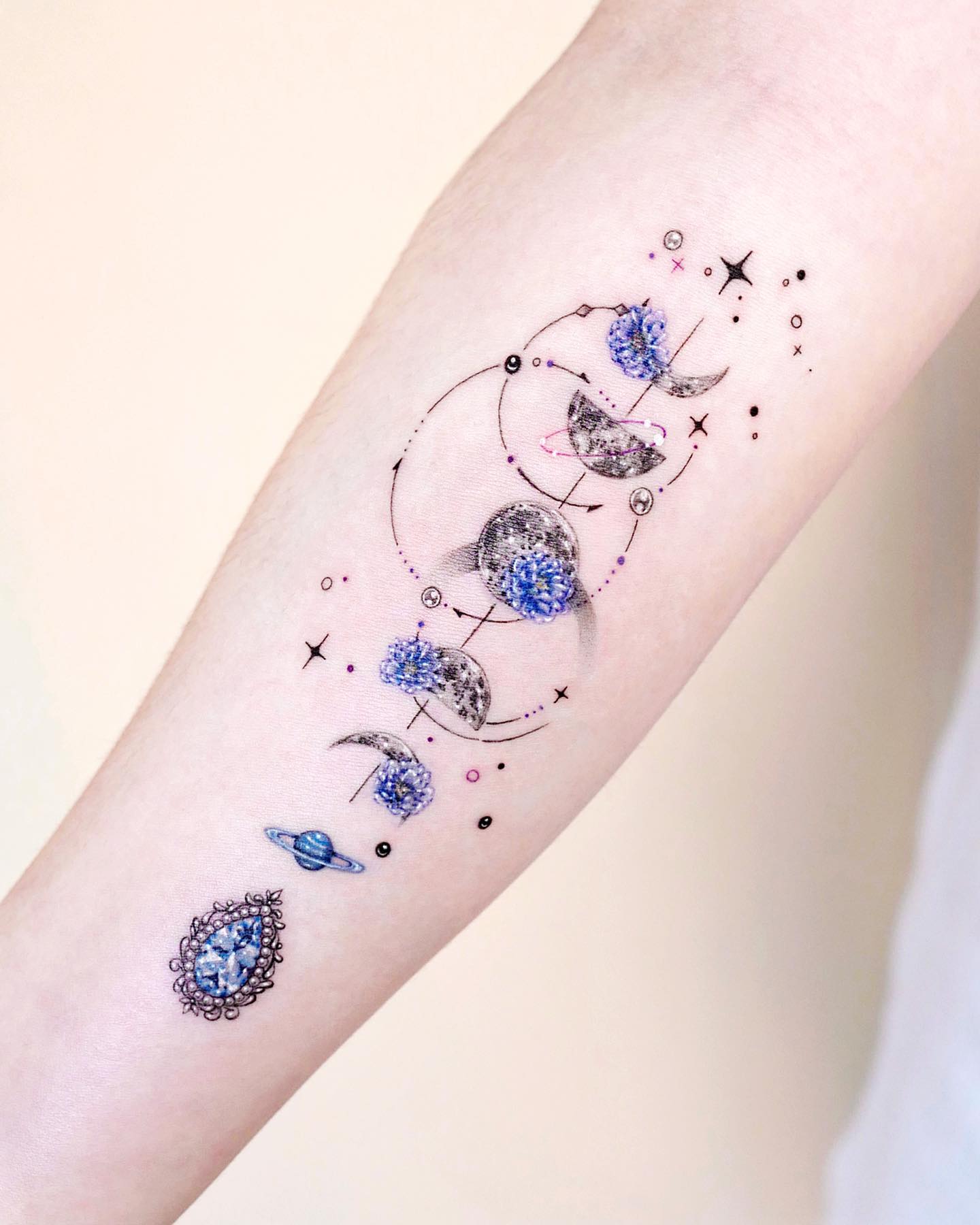 The tattoo features a swirling arrangement of moons and flowers in shades of blue, creating a cosmic theme.