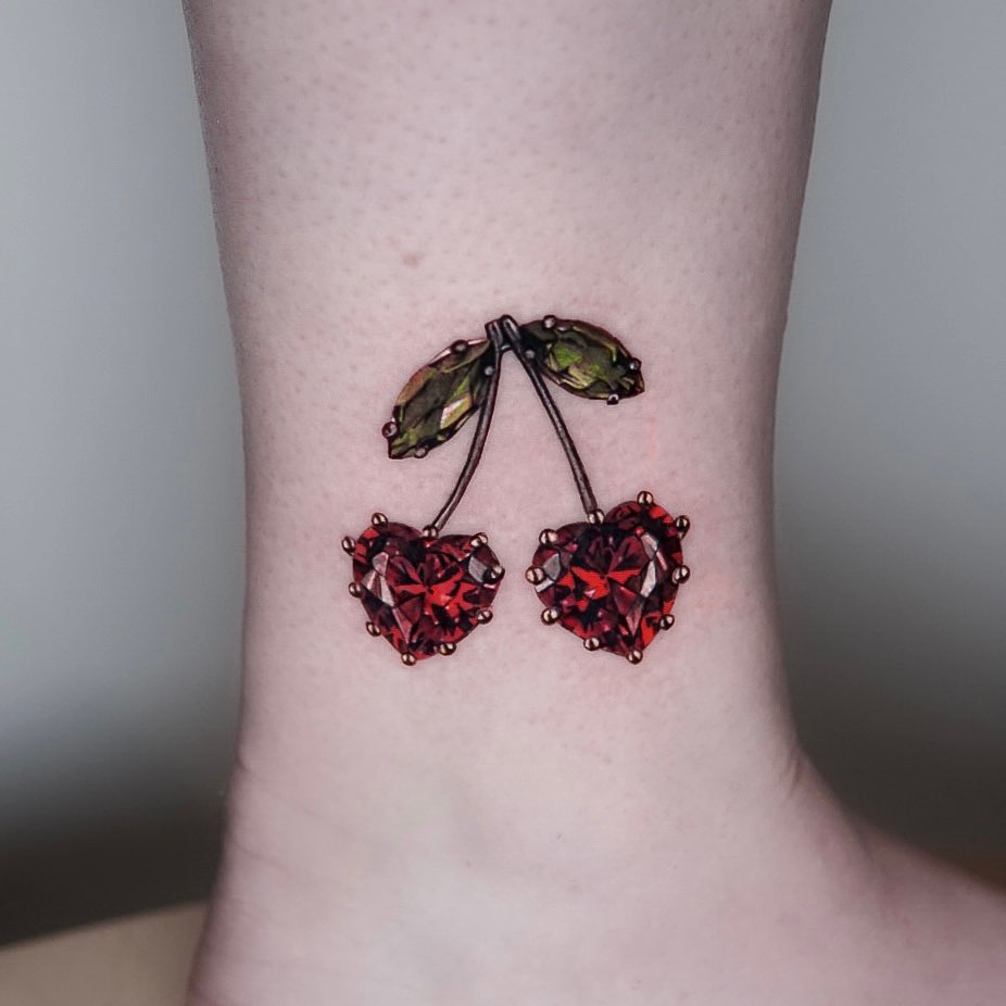 The tattoo features two heart-shaped garnet gems styled as cherries, complete with delicate green leaves.