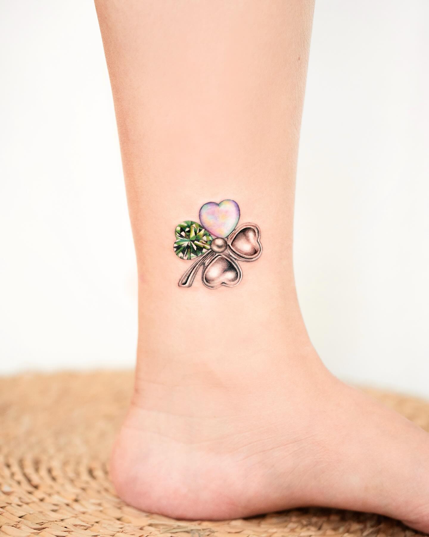 The tattoo features a heart-shaped charm alongside a detailed clover, combining elements of luck and love.