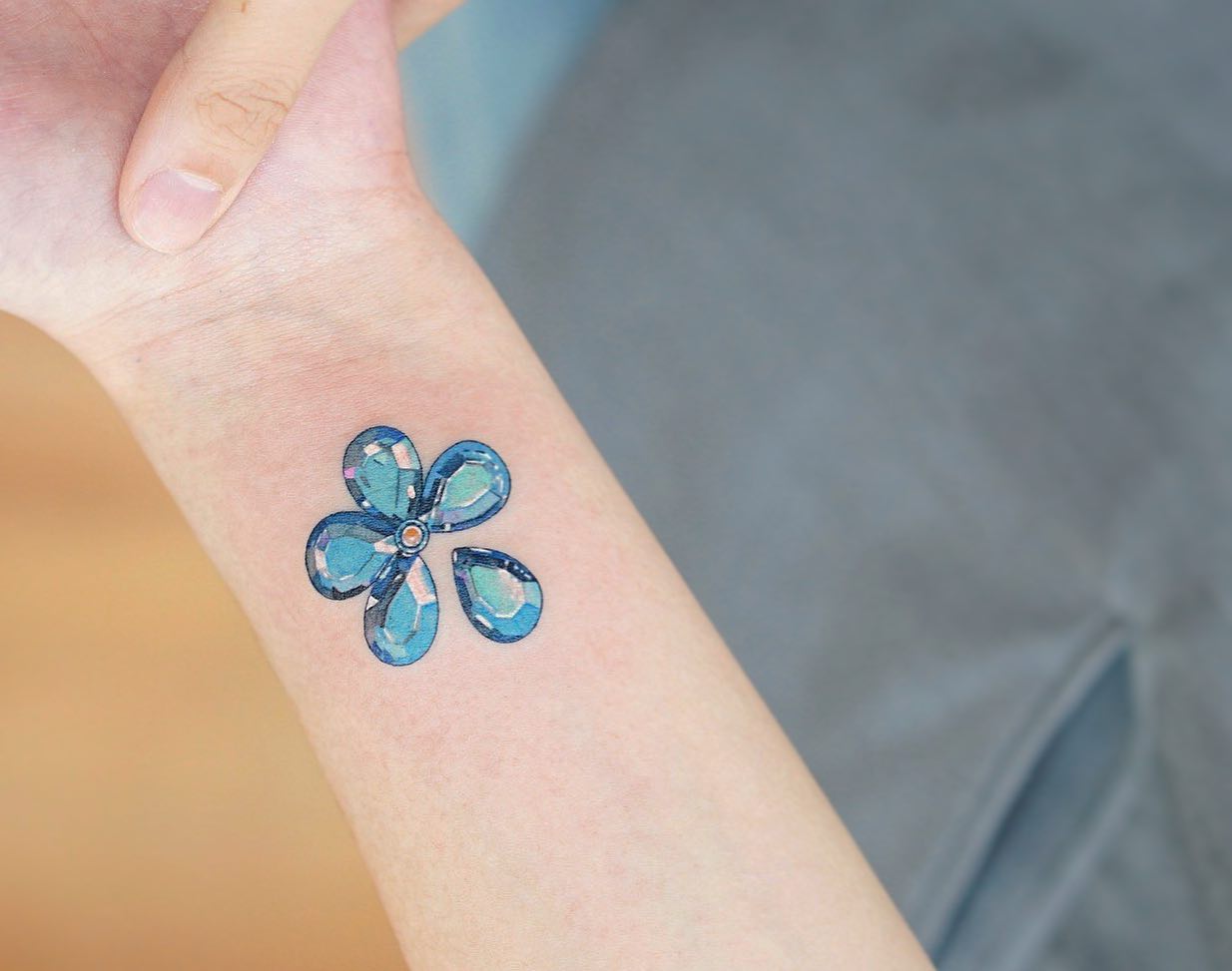 The tattoo features a flower design composed of blue gemstone-like petals that shimmer with depth and texture.
