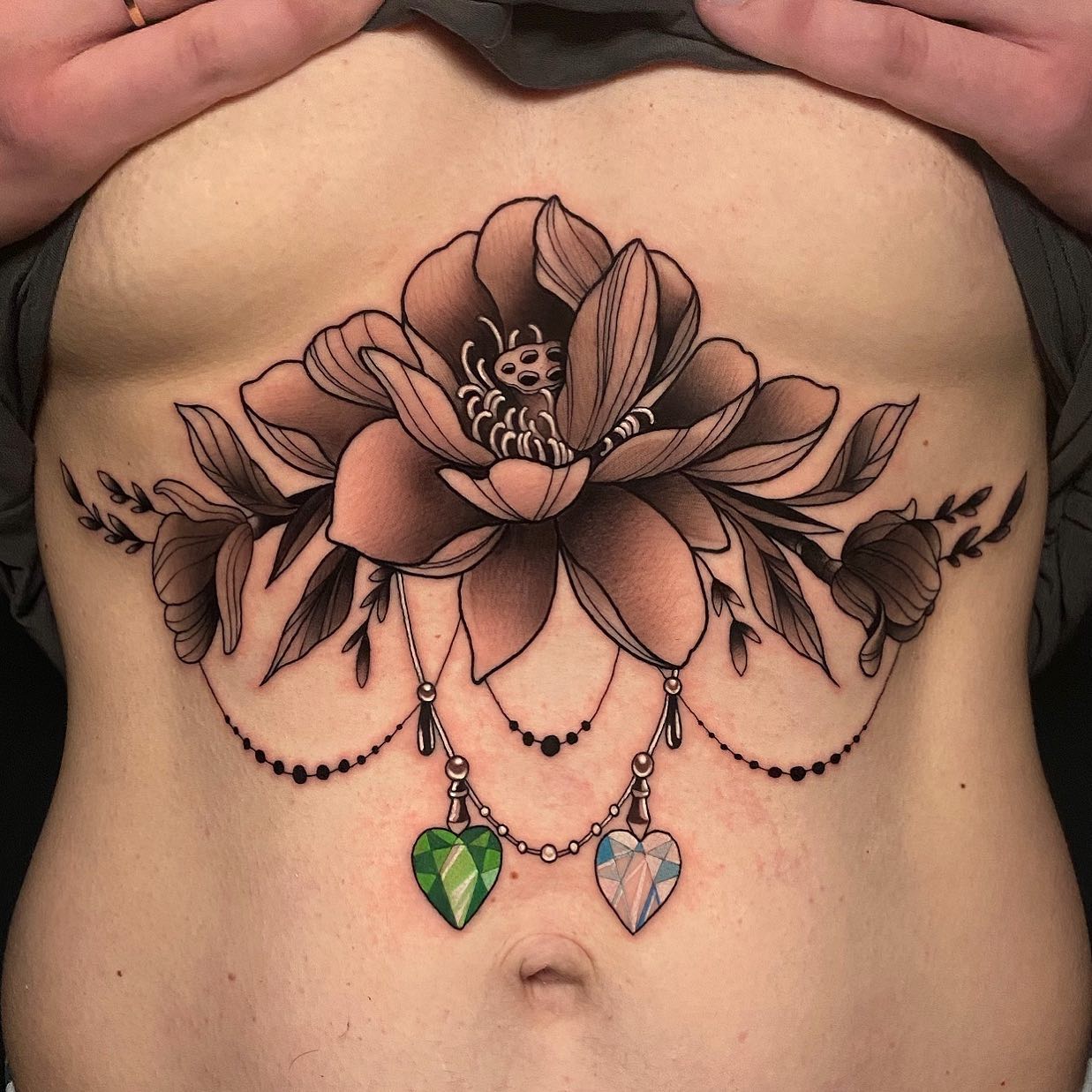 The tattoo artist skillfully uses shading and highlights to create a three-dimensional effect, making the gems appear realistic and eye-catching.
