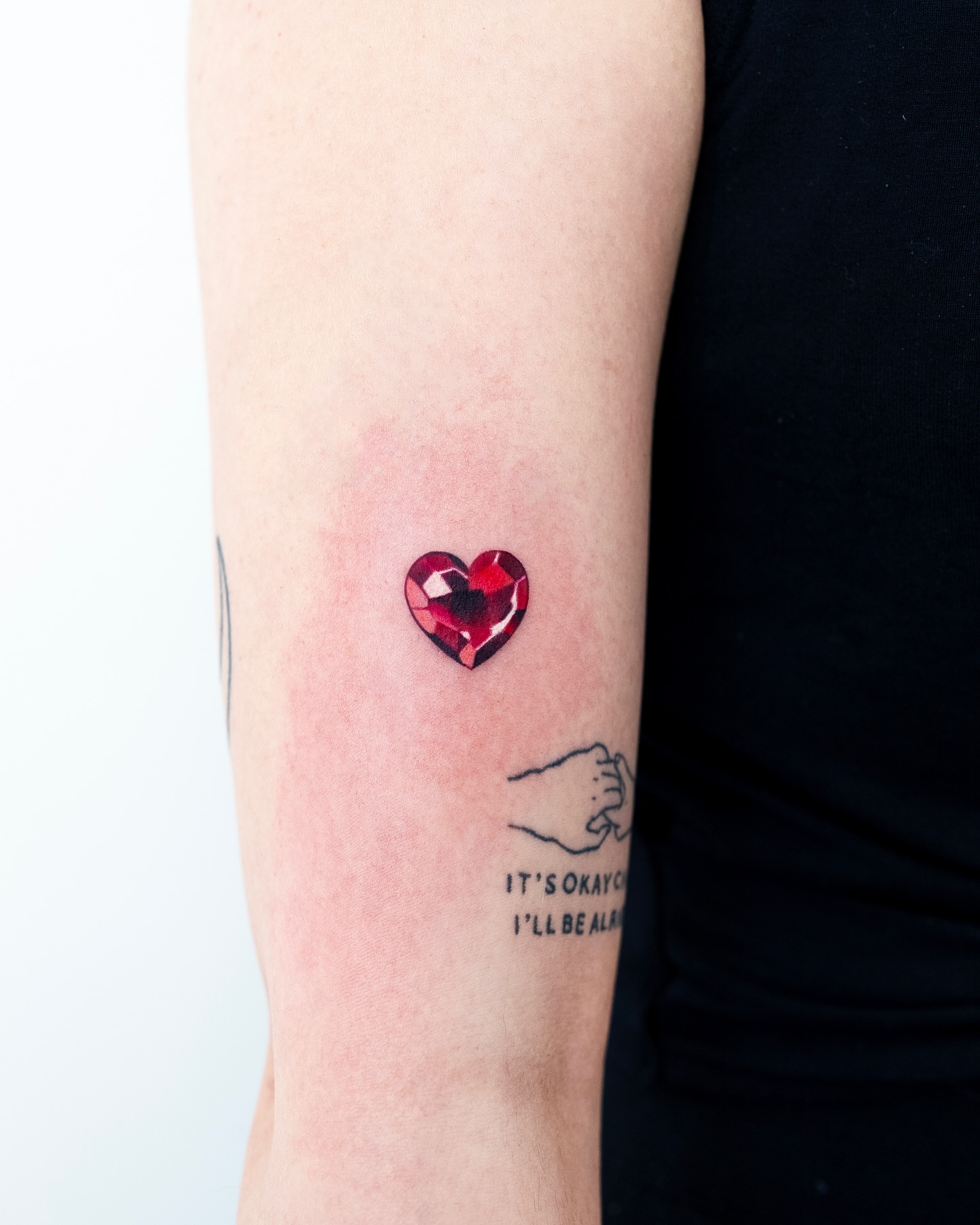 The heart-shaped ruby tattoo features vibrant red and black details that create a striking, gem-like appearance.