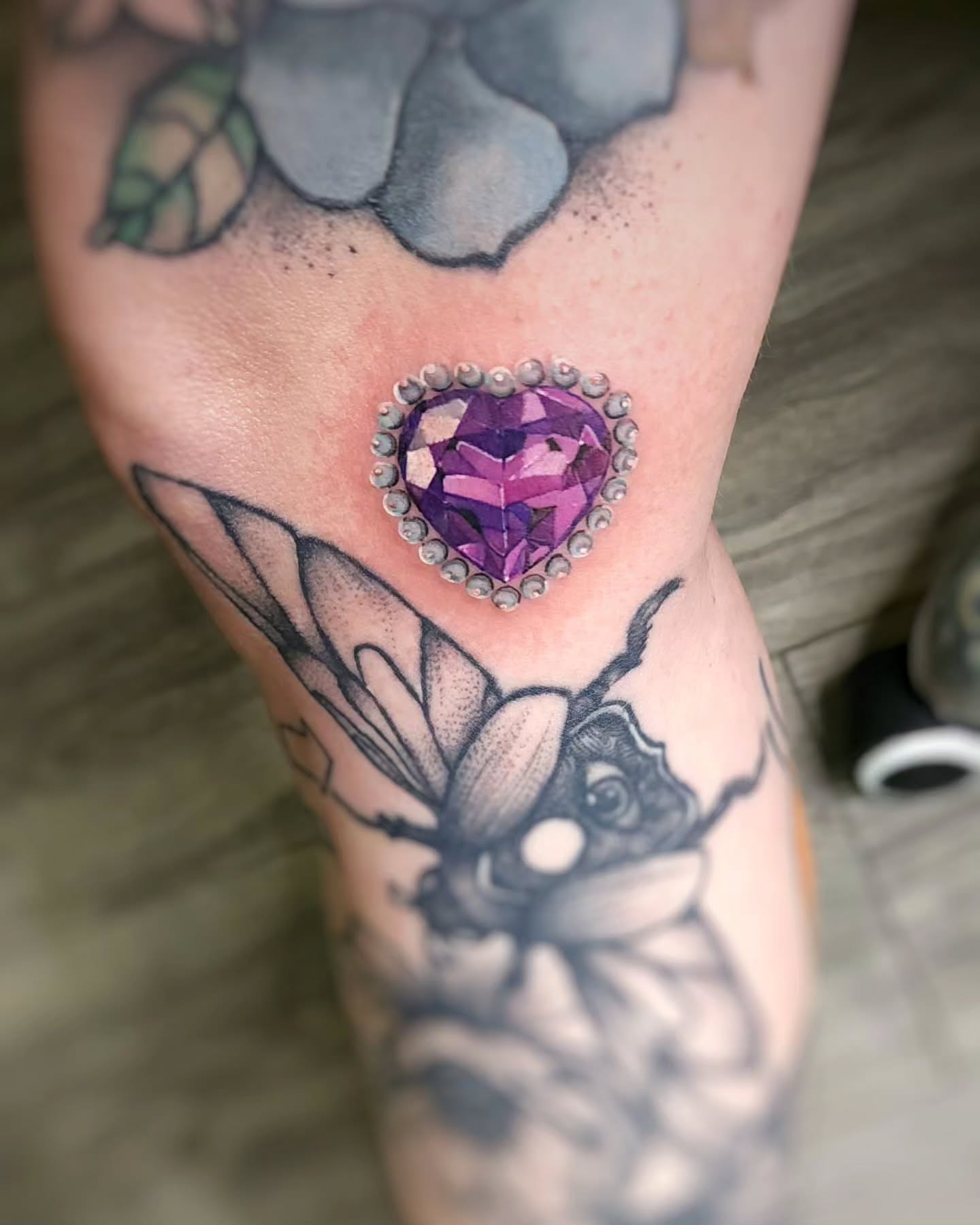 The heart-shaped amethyst tattoo stands out with its rich purple hues and intricate detailing.