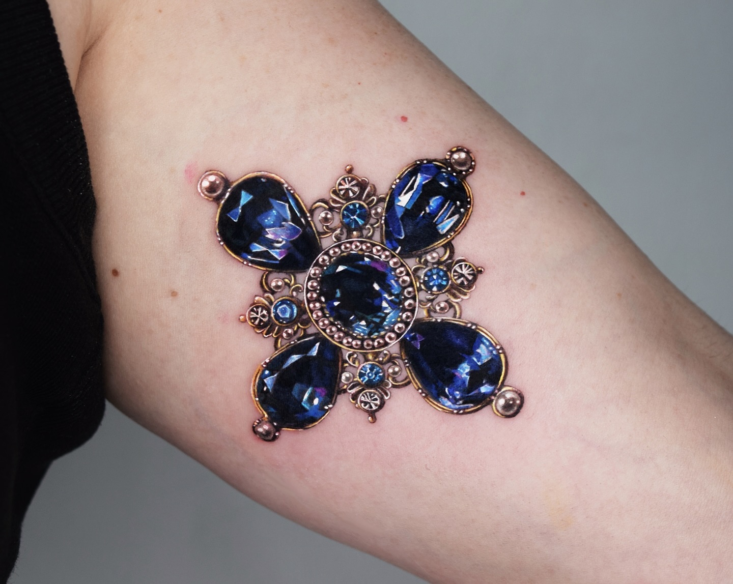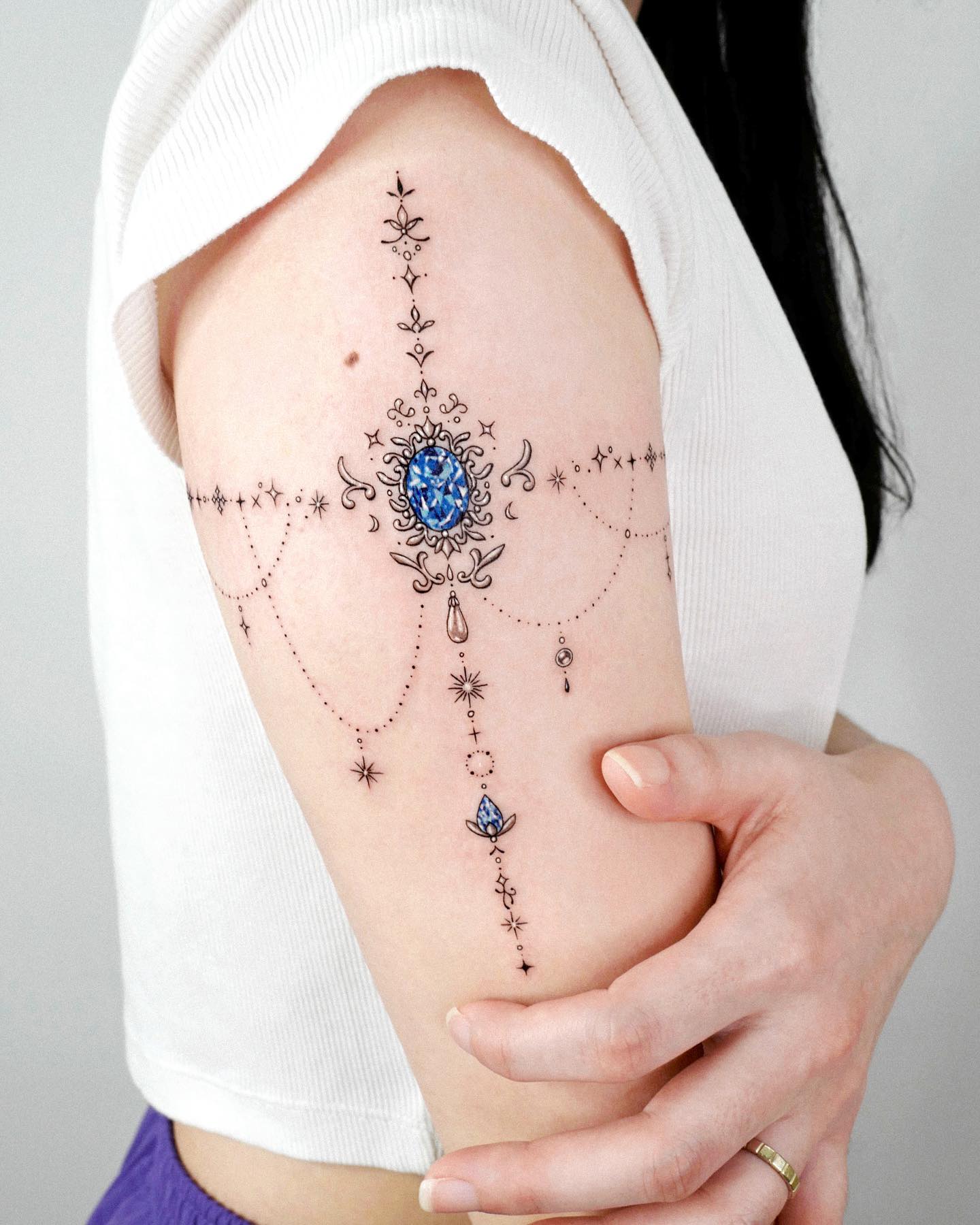 This tattoo features a striking arrangement of deep blue gemstones that resemble sapphires, set in a decorative pattern.