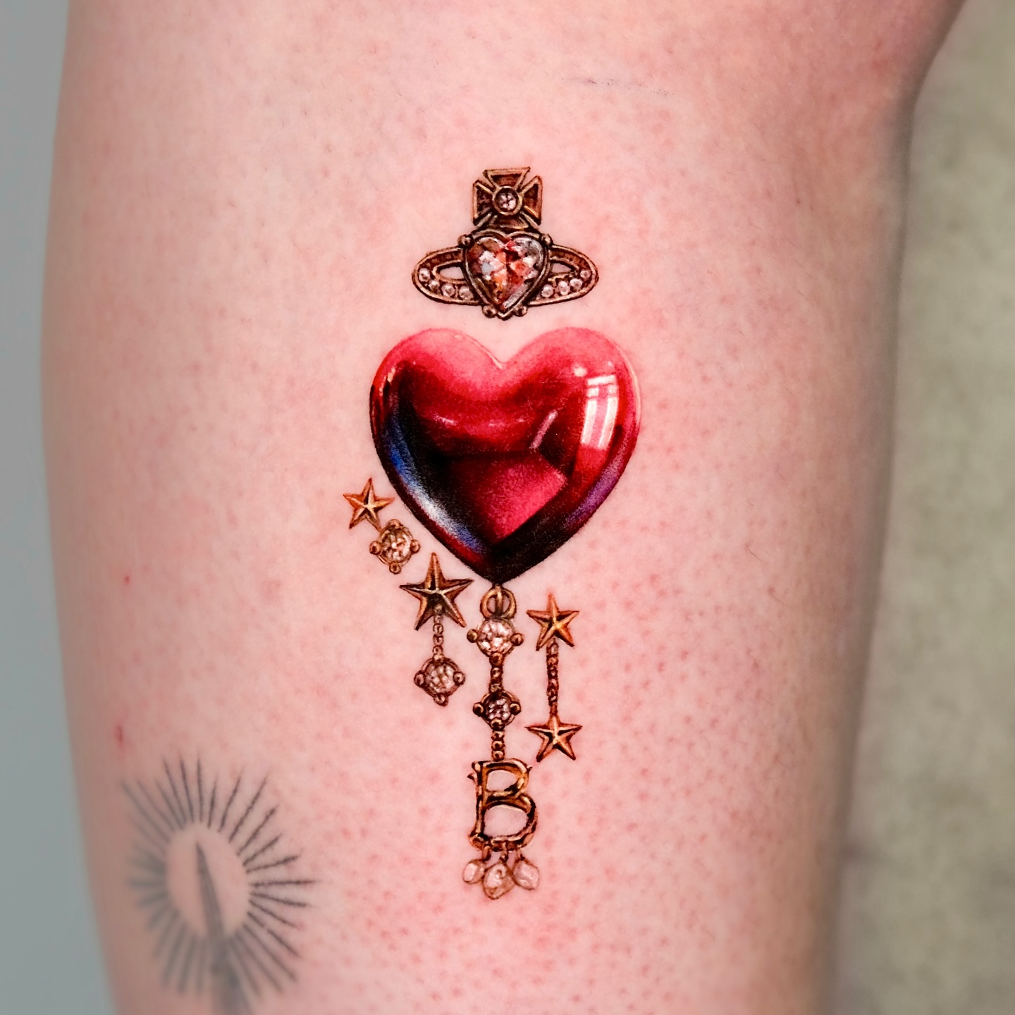 The tattoo features a large, heart-shaped gem rendered in deep red, creating a striking focal point.