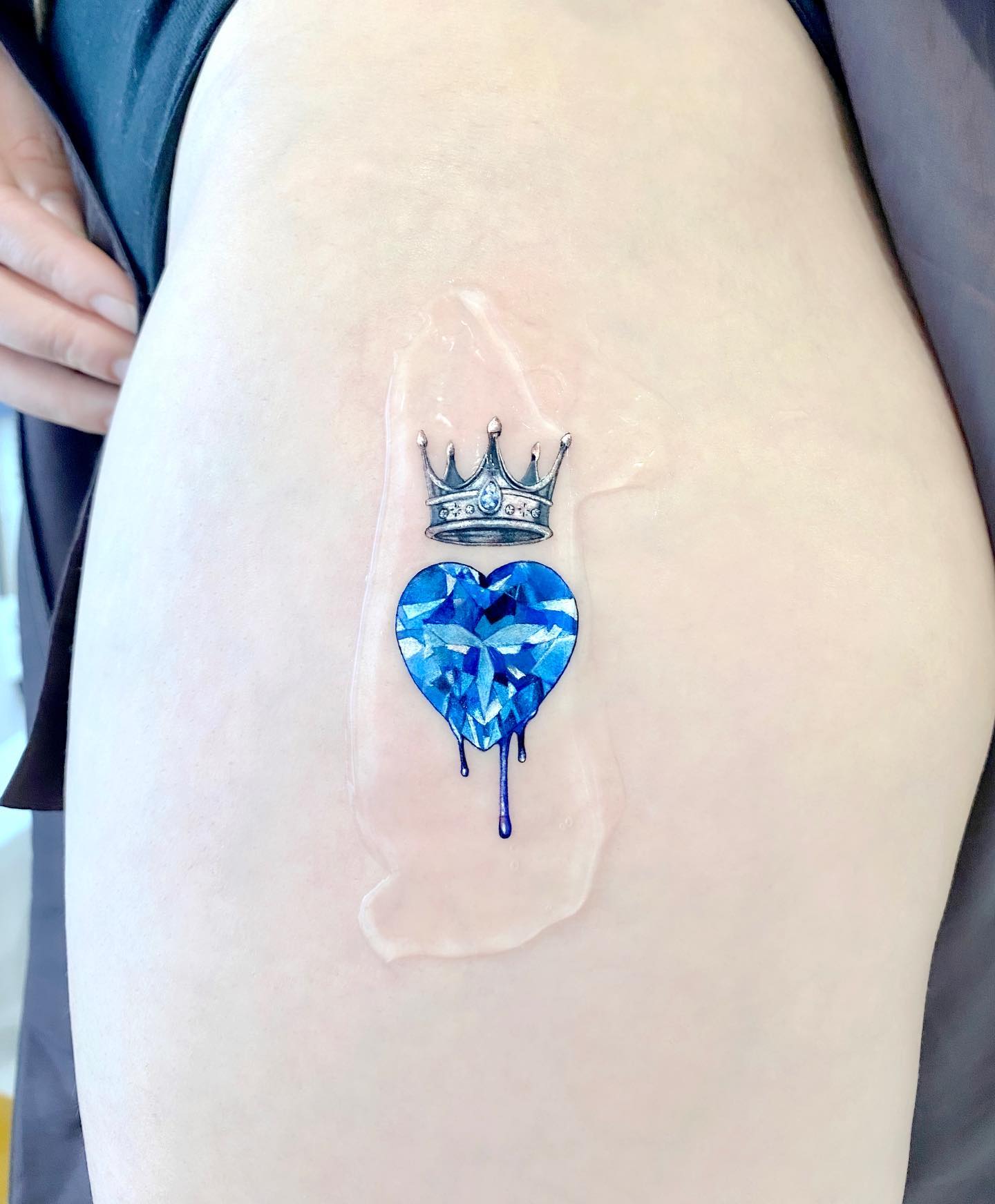 The tattoo features a detailed blue heart adorned with a crown, creating a striking focal point.