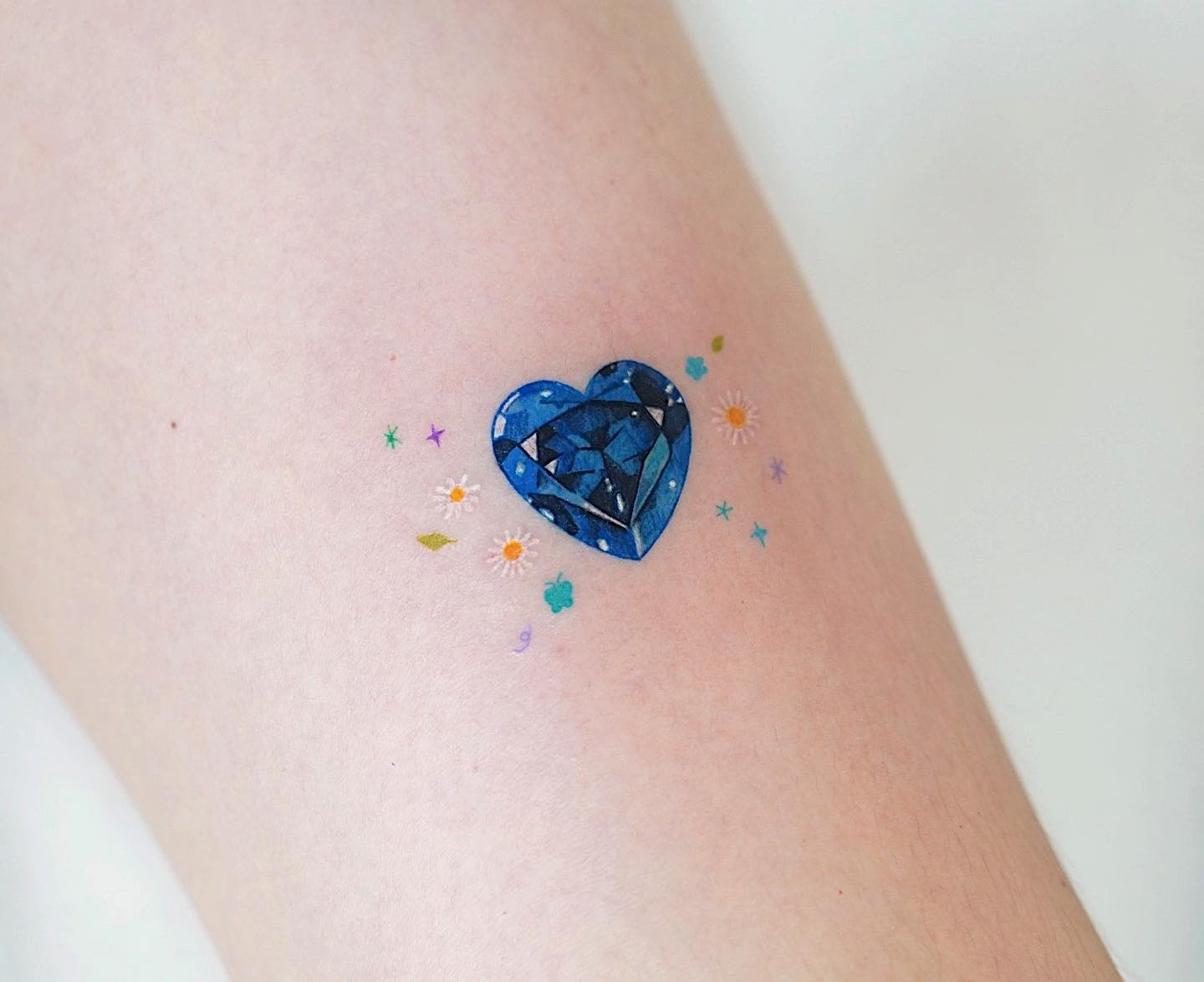 The tattoo features a prominent blue gemstone surrounded by delicate floral and star motifs.