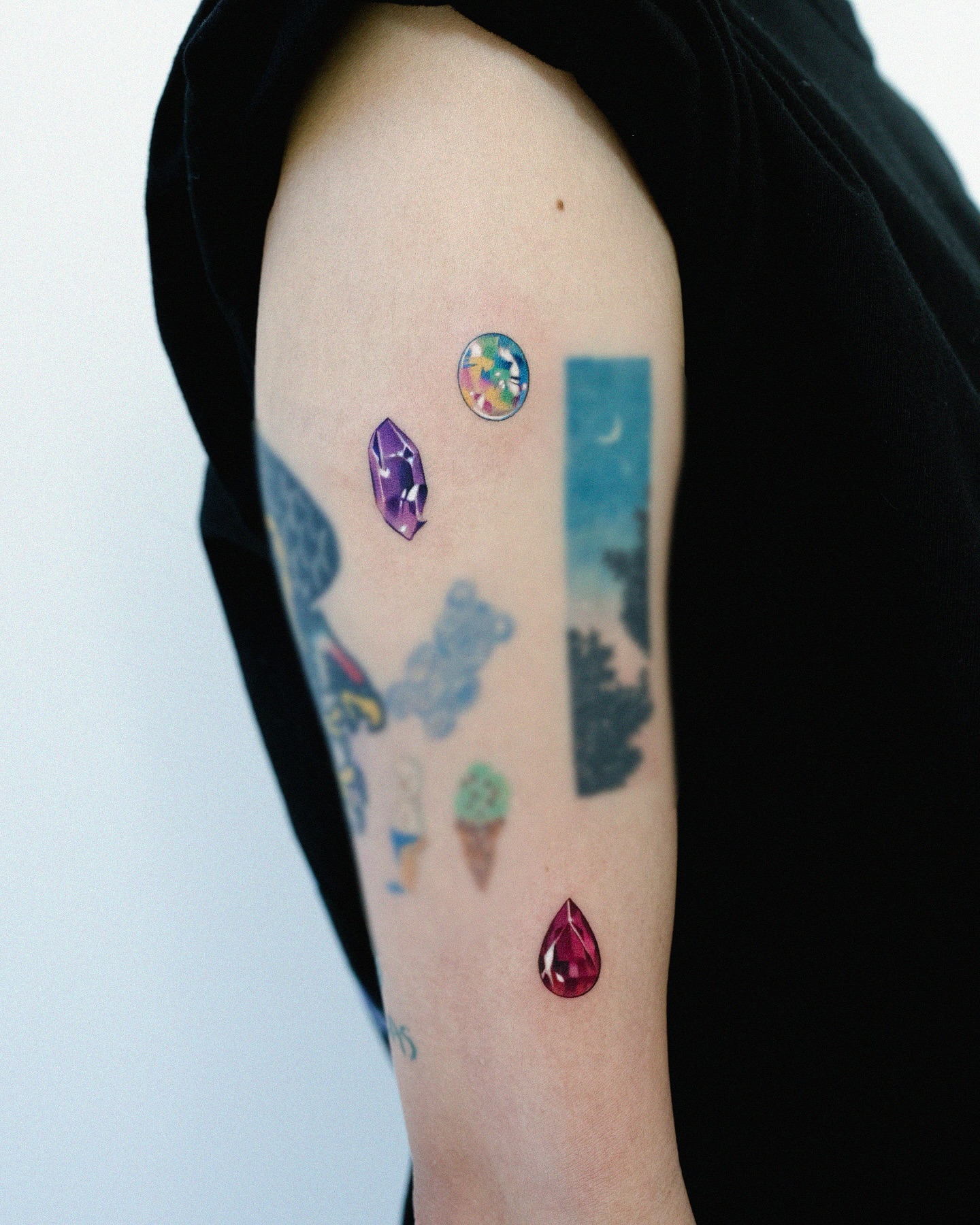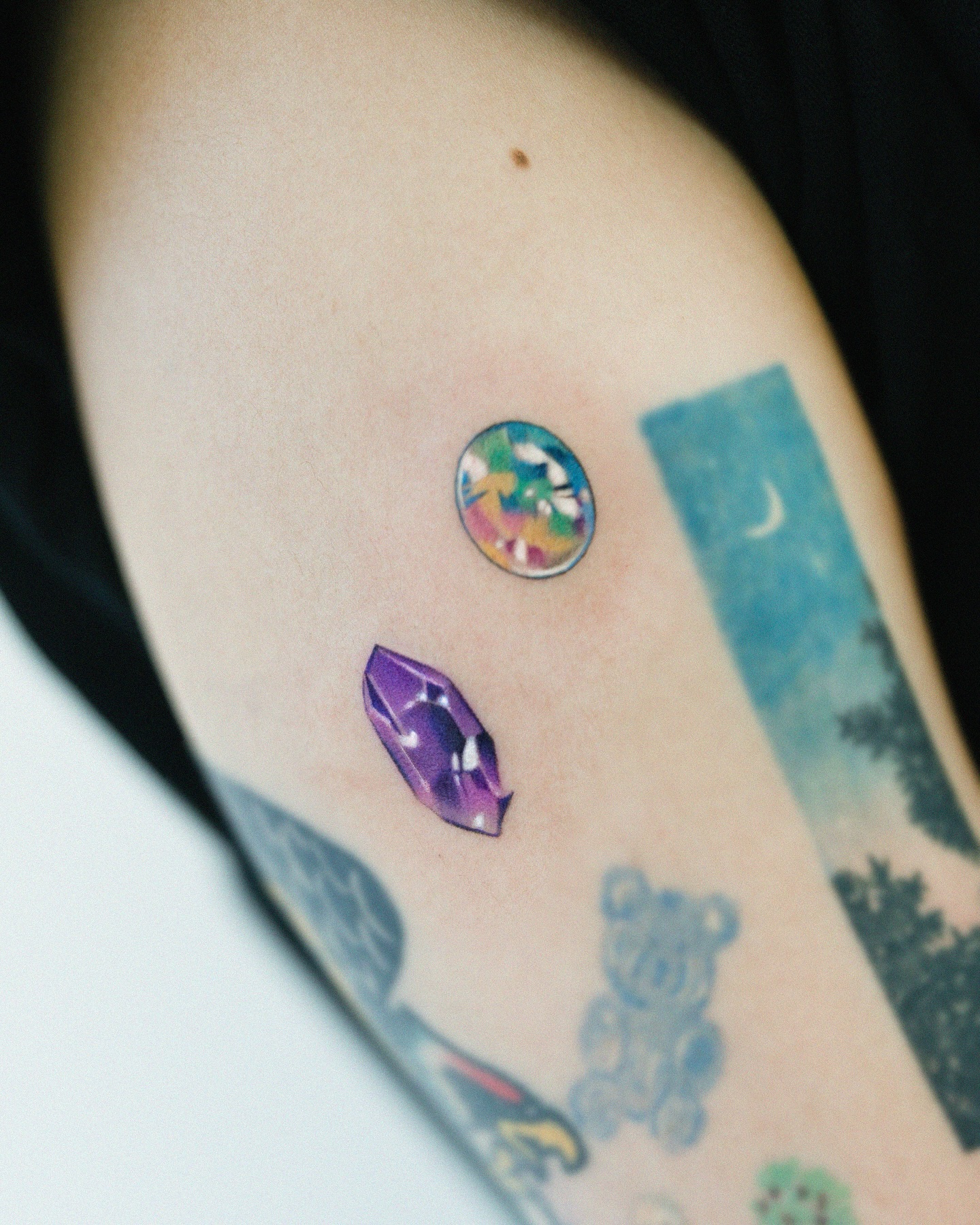 The vibrant gemstone tattoos feature various colors and shapes, including a purple crystal and a bright blue circular design.