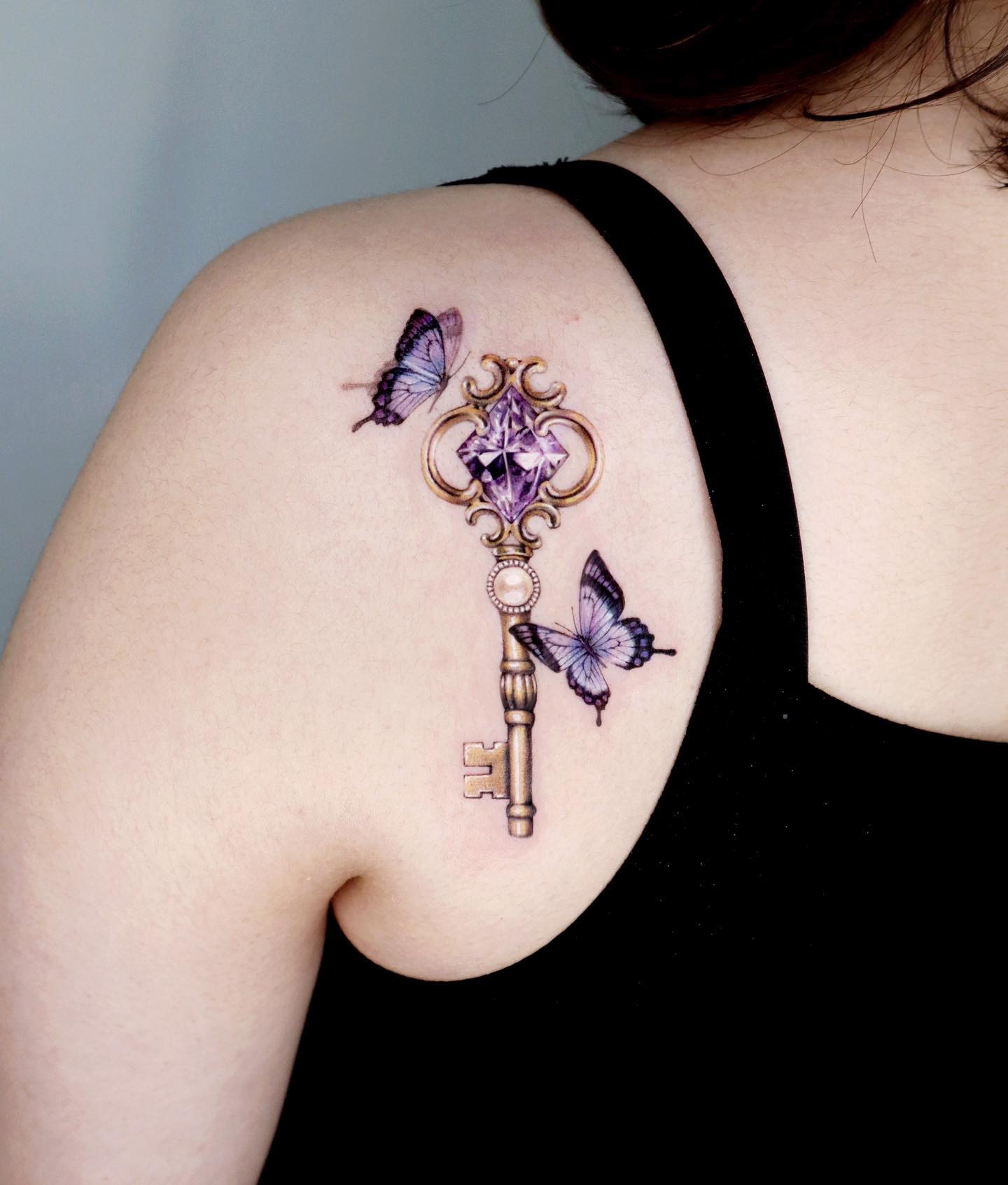 The intricate details of the key and the soft colors of the butterflies create a harmonious blend that enhances the tattoo’s overall appeal.