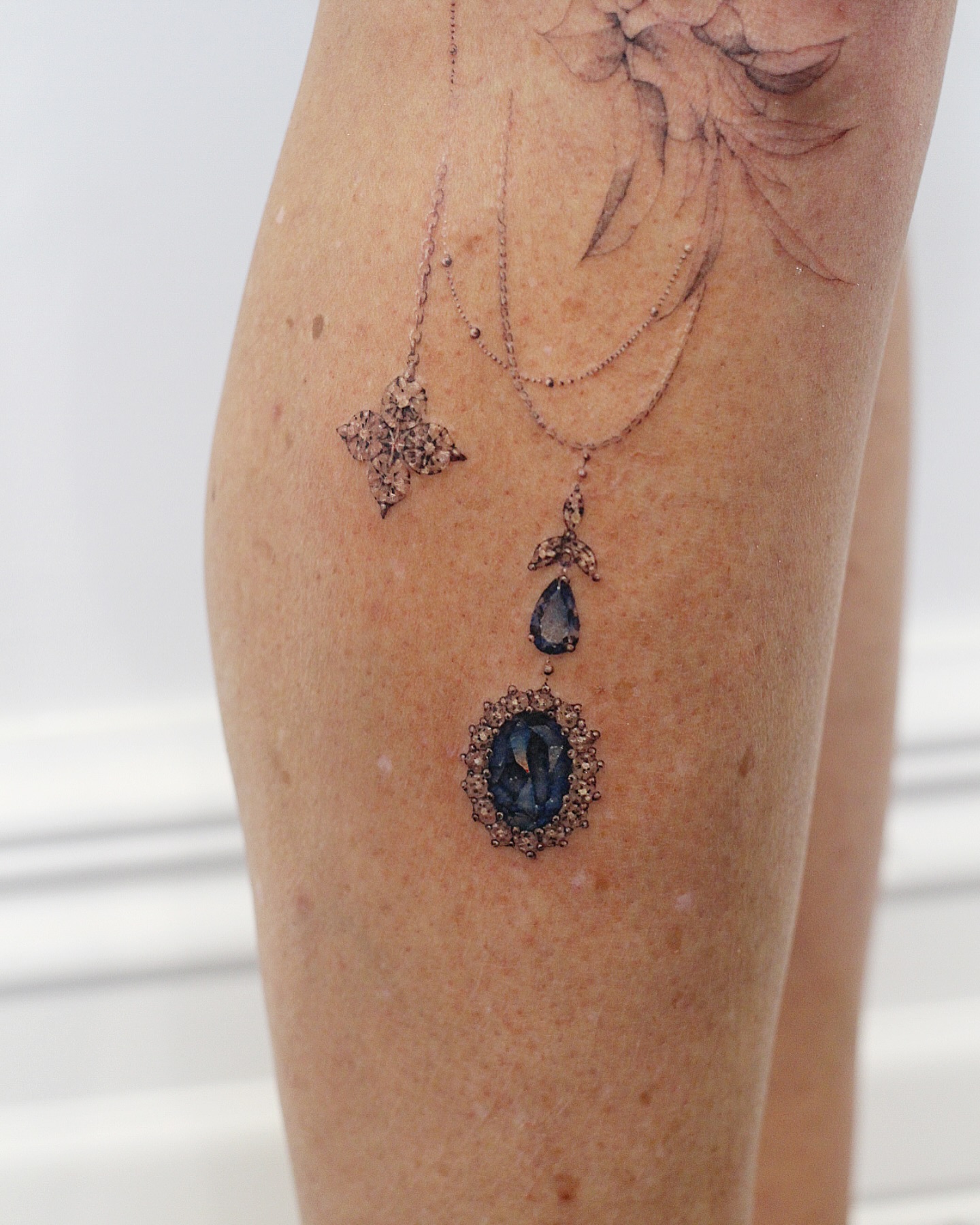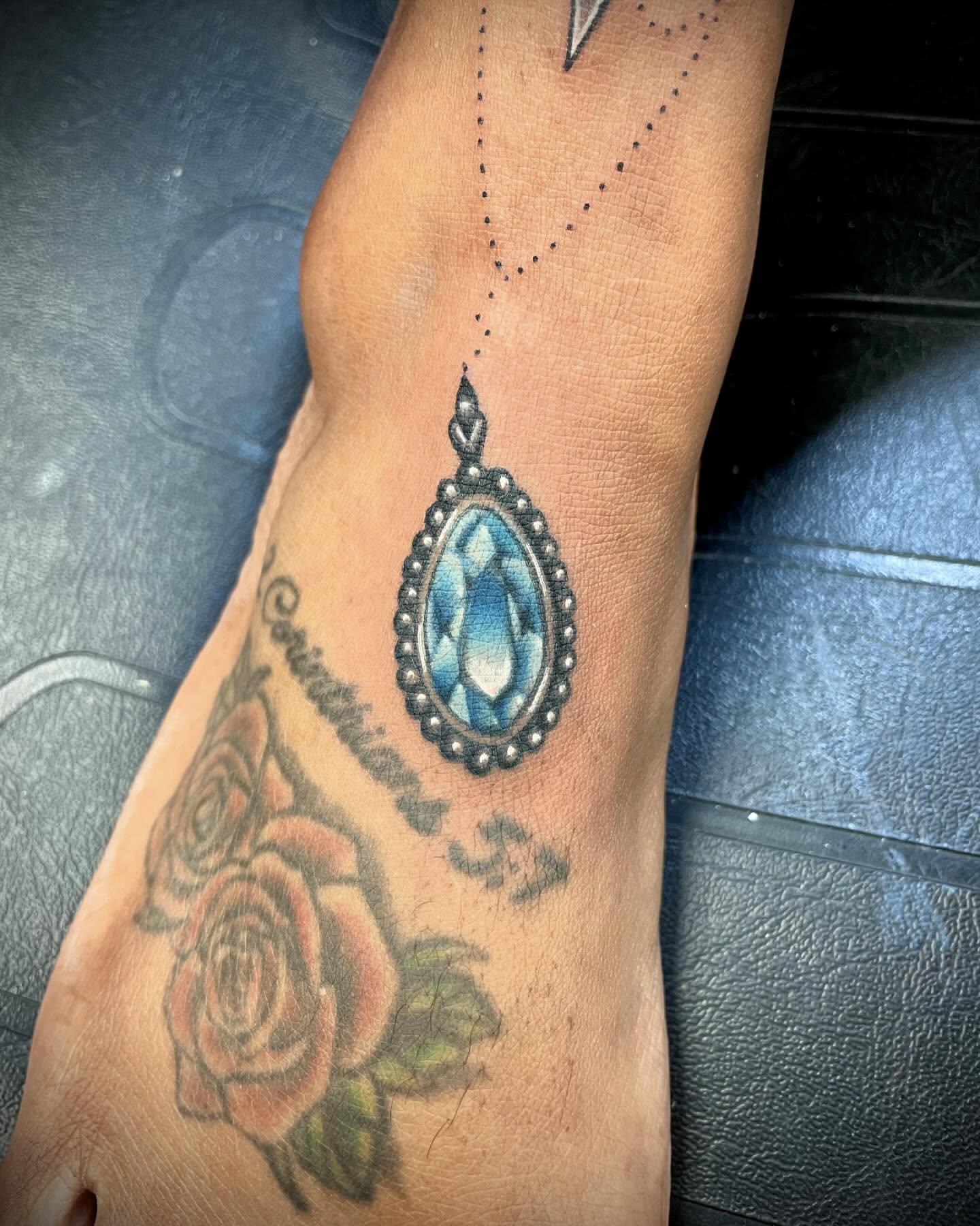 The tattoo features a detailed blue gemstone pendant, surrounded by intricate beading that enhances its appearance.