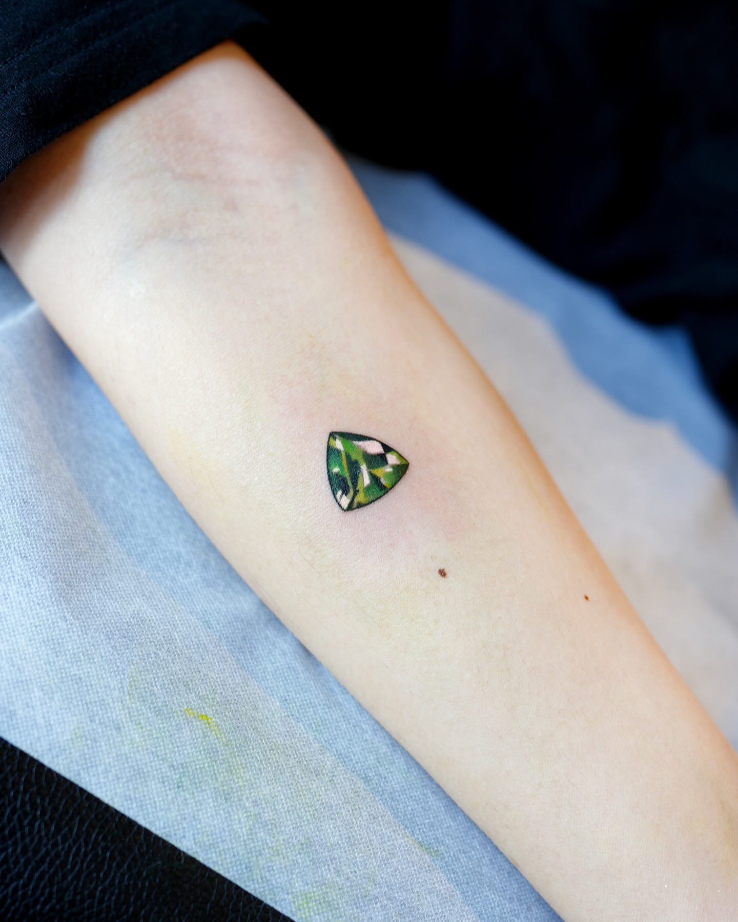 The tattoo features a triangular shape filled with a mix of green hues and subtle pink accents, resembling a gemstone.