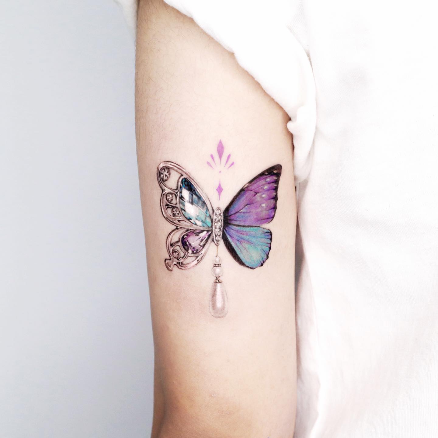 The butterfly tattoo features vibrant purple and blue wings, complemented by intricate gemstone accents.