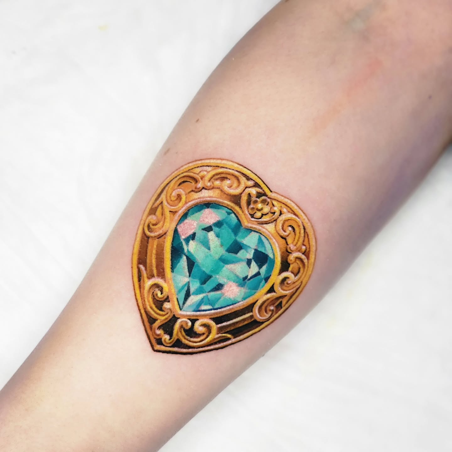 The heart-shaped gemstone tattoo features intricate details and a vibrant teal color that captures attention.