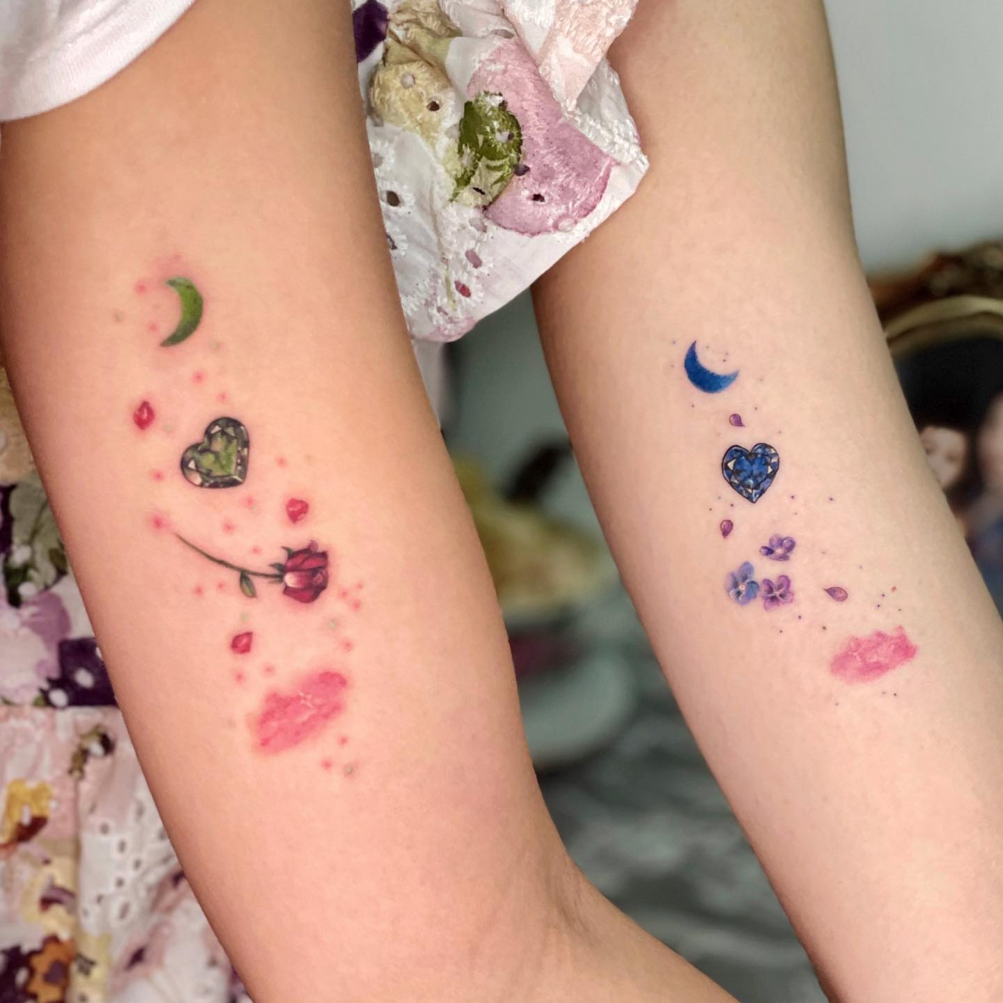 The tattoos feature a blend of floral designs and celestial shapes, including a rose, hearts, and crescent moons.
