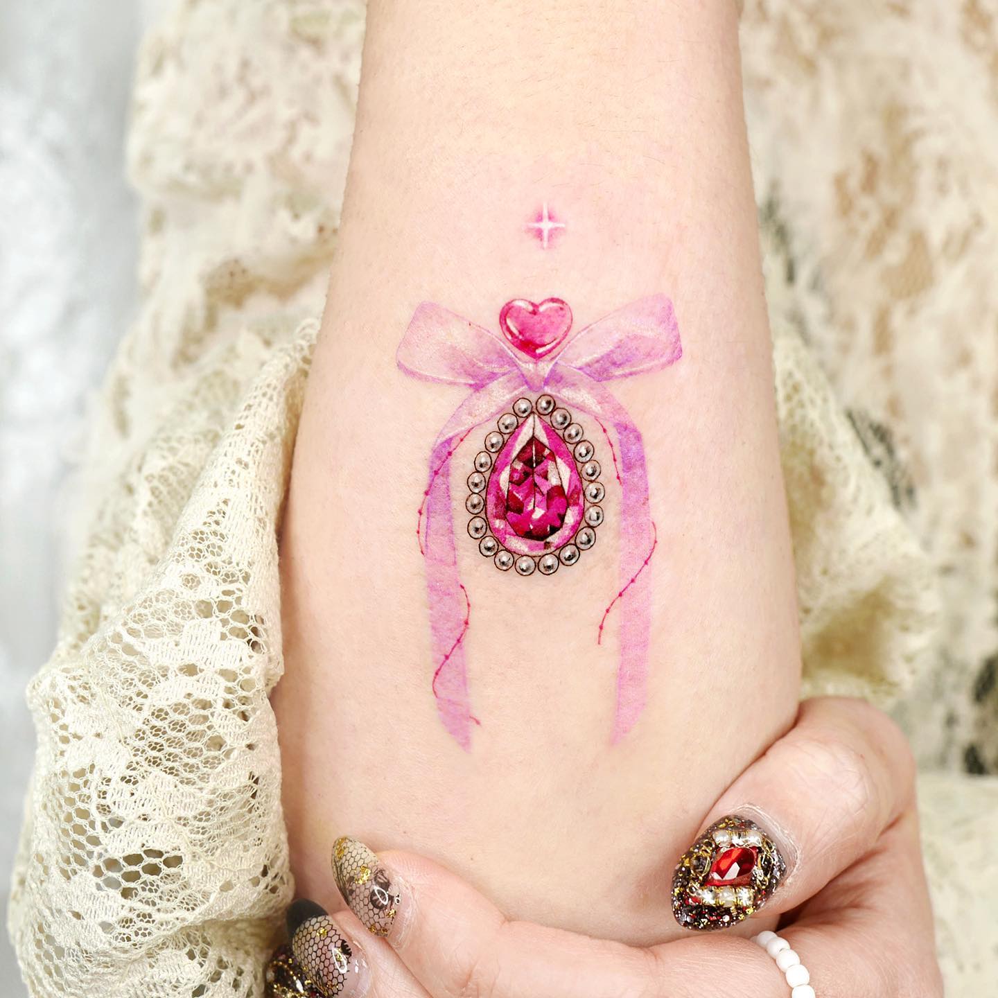 The tattoo features a vibrant pink gemstone surrounded by a delicate ribbon and heart motif.