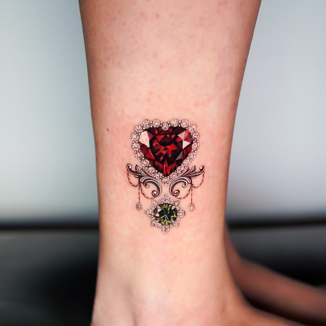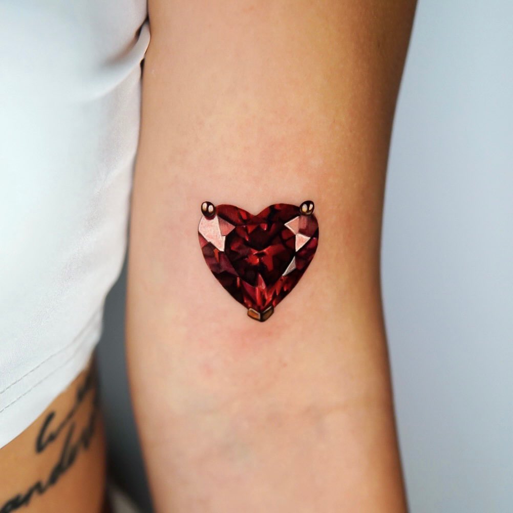 The heart-shaped garnet tattoo features deep red hues that mimic the look of a faceted gemstone.