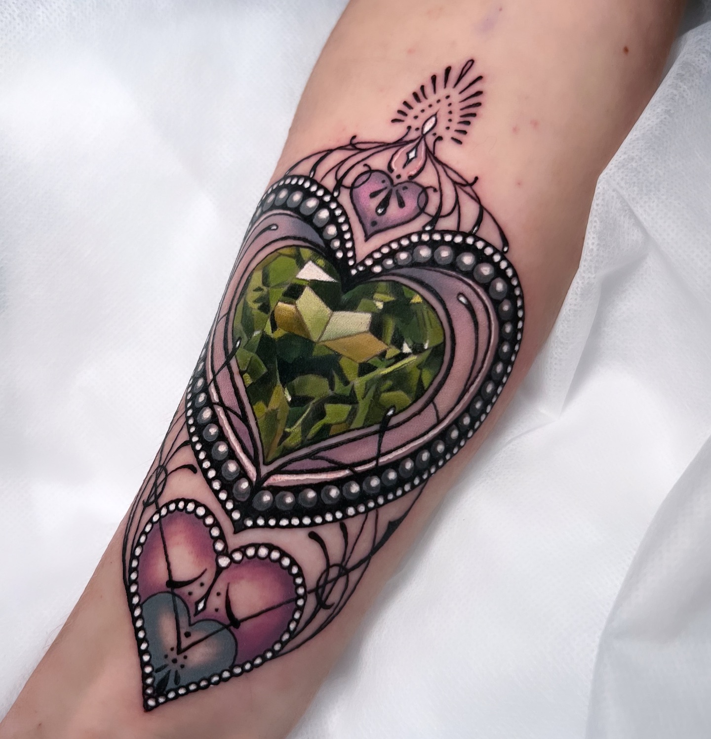 The tattoo features intricate heart shapes, with a striking green birthstone at the center.