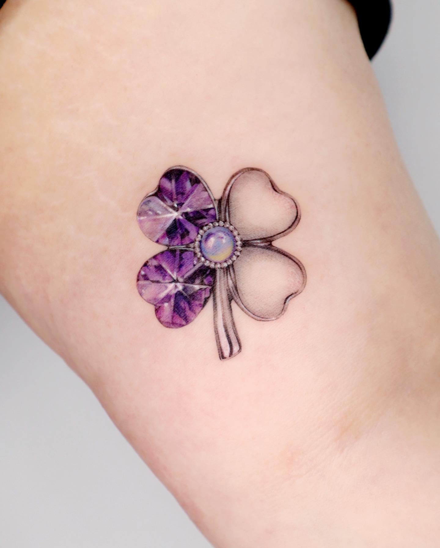 The design features a purple clover, showcasing vibrant facets that mimic the look of gemstones.