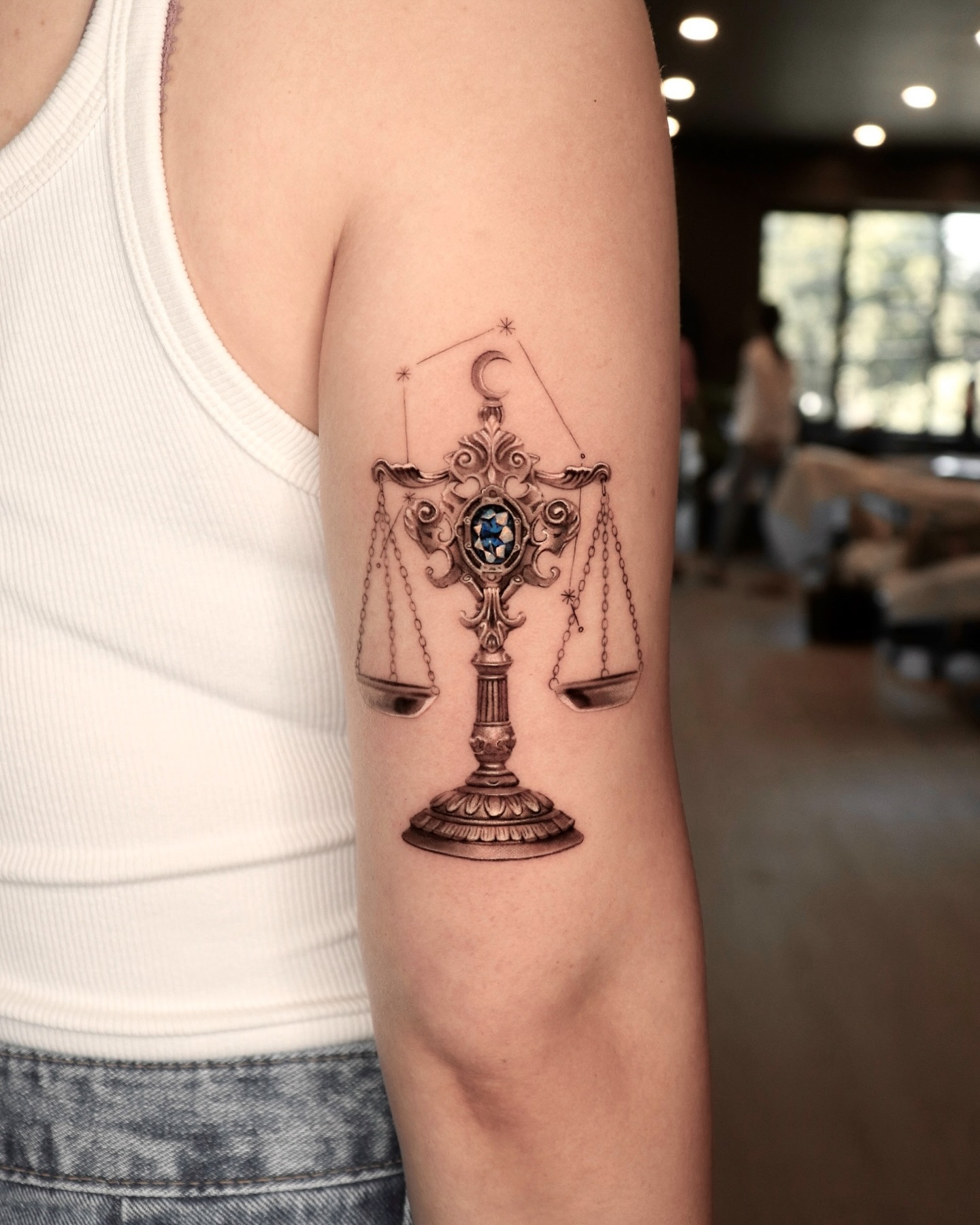 The tattoo features an intricately designed scales of justice, complete with a prominent blue gemstone at its center.
