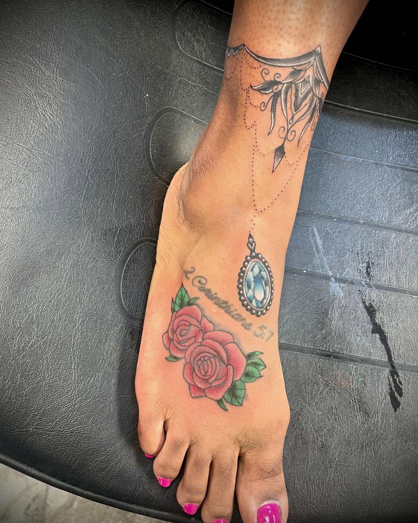 The tattoo features vibrant roses in soft pink and green hues alongside a detailed blue gemstone pendant.