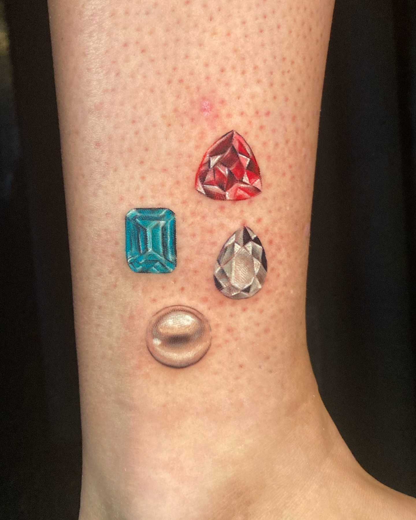 The tattoo features a collection of four realistic gemstones in various shapes and colors, including a blue rectangular stone, a red triangular gem, a clear teardrop, and a shiny round pearl.
