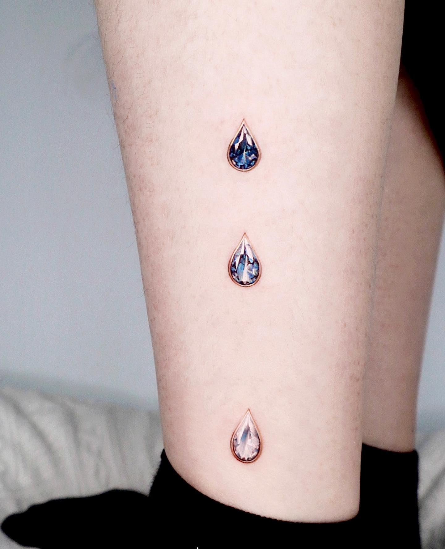 The tattoo features three pear-shaped gemstones in varying shades of blue and clear, each enclosed in a delicate outline.