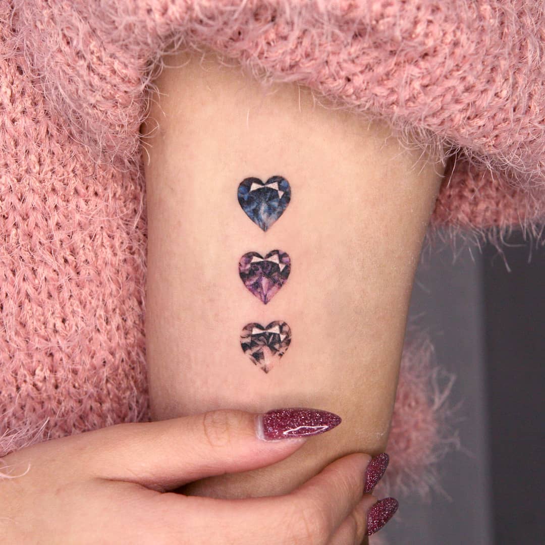 Three heart-shaped gemstones in varying colors create a striking visual effect on the skin.