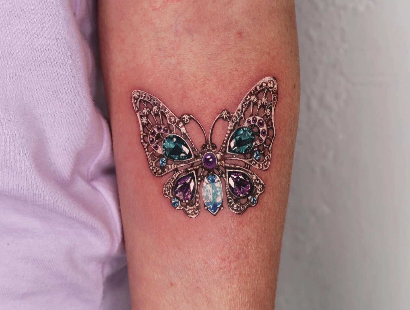 The tattoo features a butterfly adorned with various gemstones in shades of teal, purple, and blue.