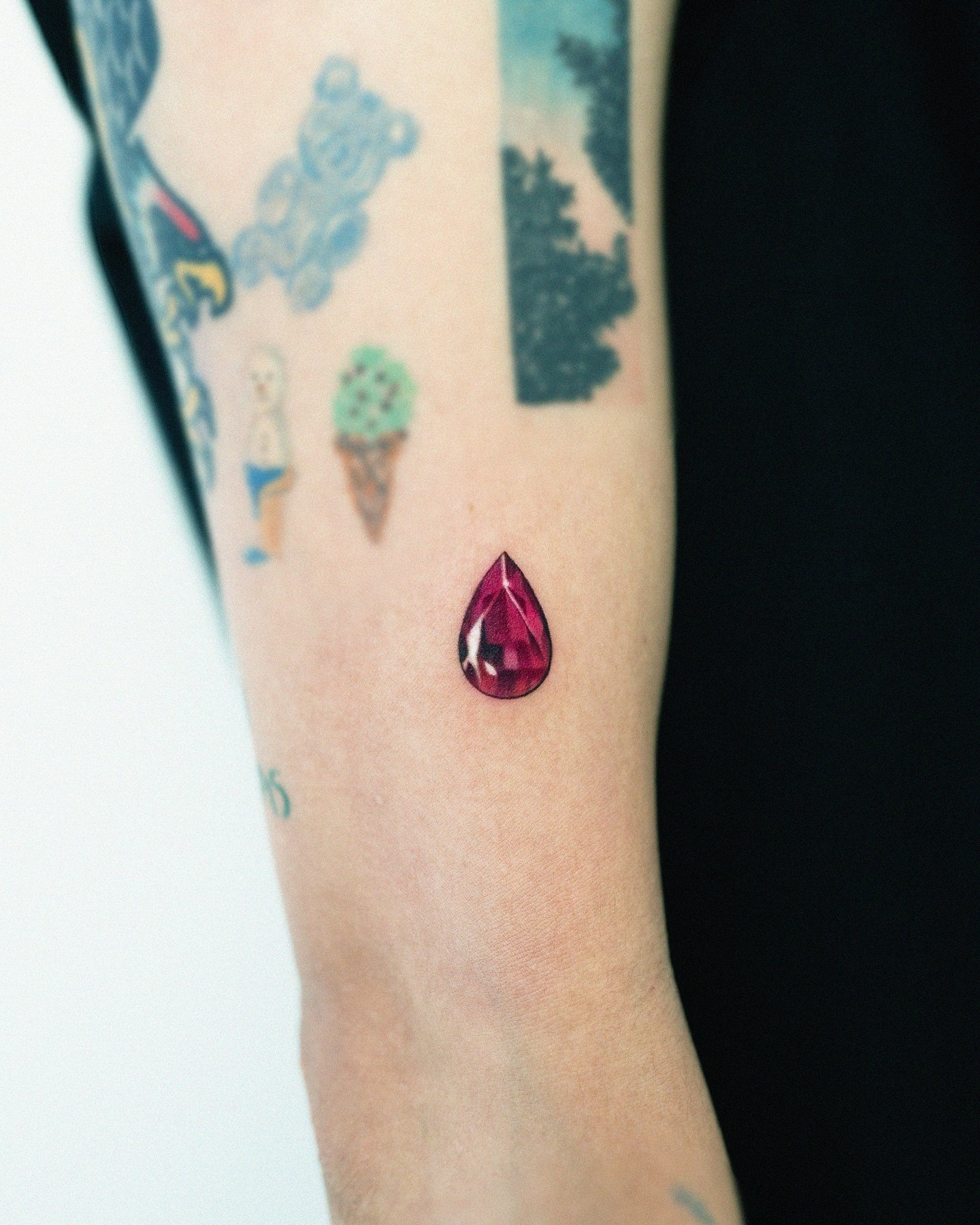 The tattoo features a detailed teardrop shape that mimics a ruby gemstone, showcasing rich shades of red and intricate shading.