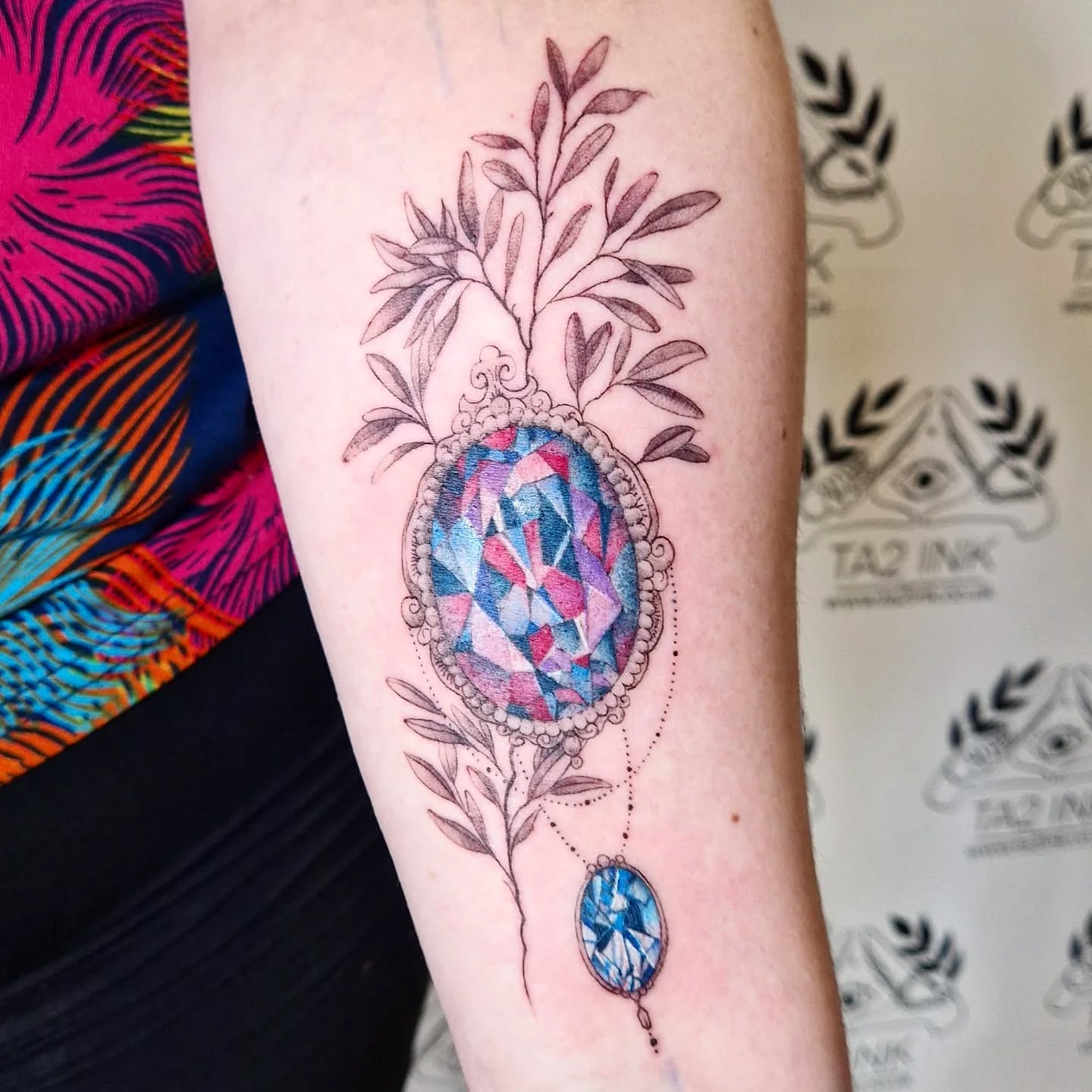 The tattoo features a large, teardrop-shaped gemstone with intricate detailing and a blend of pink and blue hues.