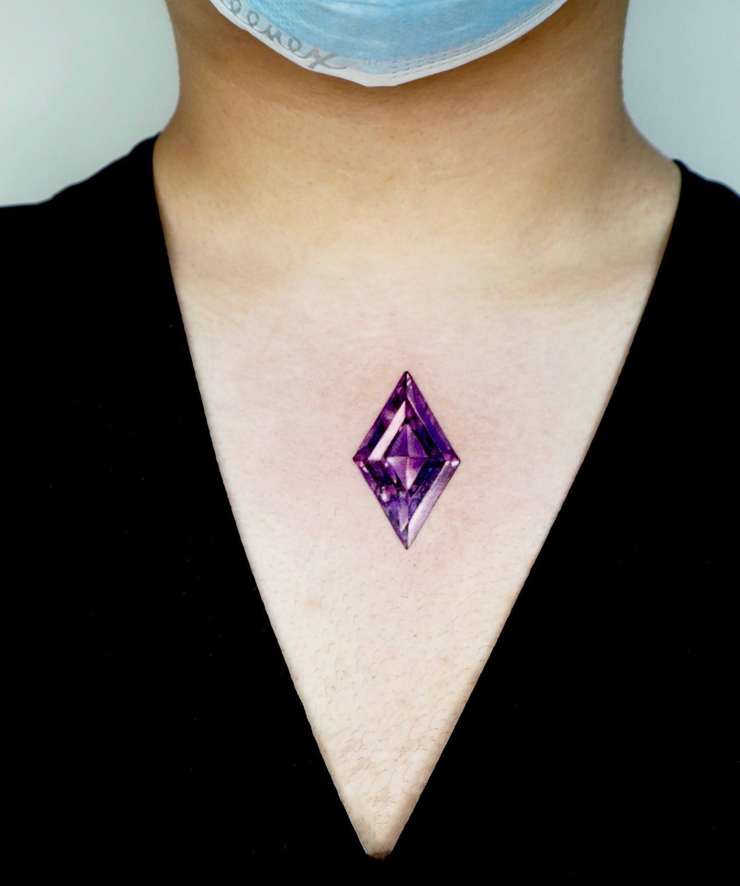 This tattoo features a striking purple amethyst in a geometric diamond shape, which is eye-catching and unique.