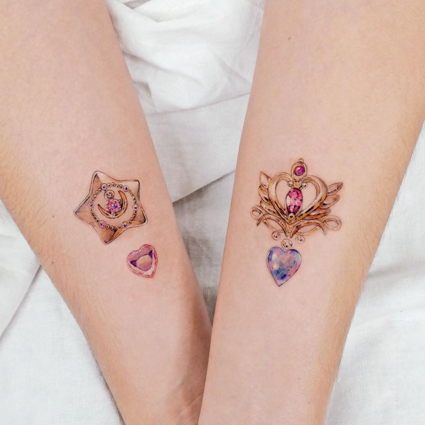 The tattoo features a star-shaped design and a heart, both adorned with colorful gemstones.