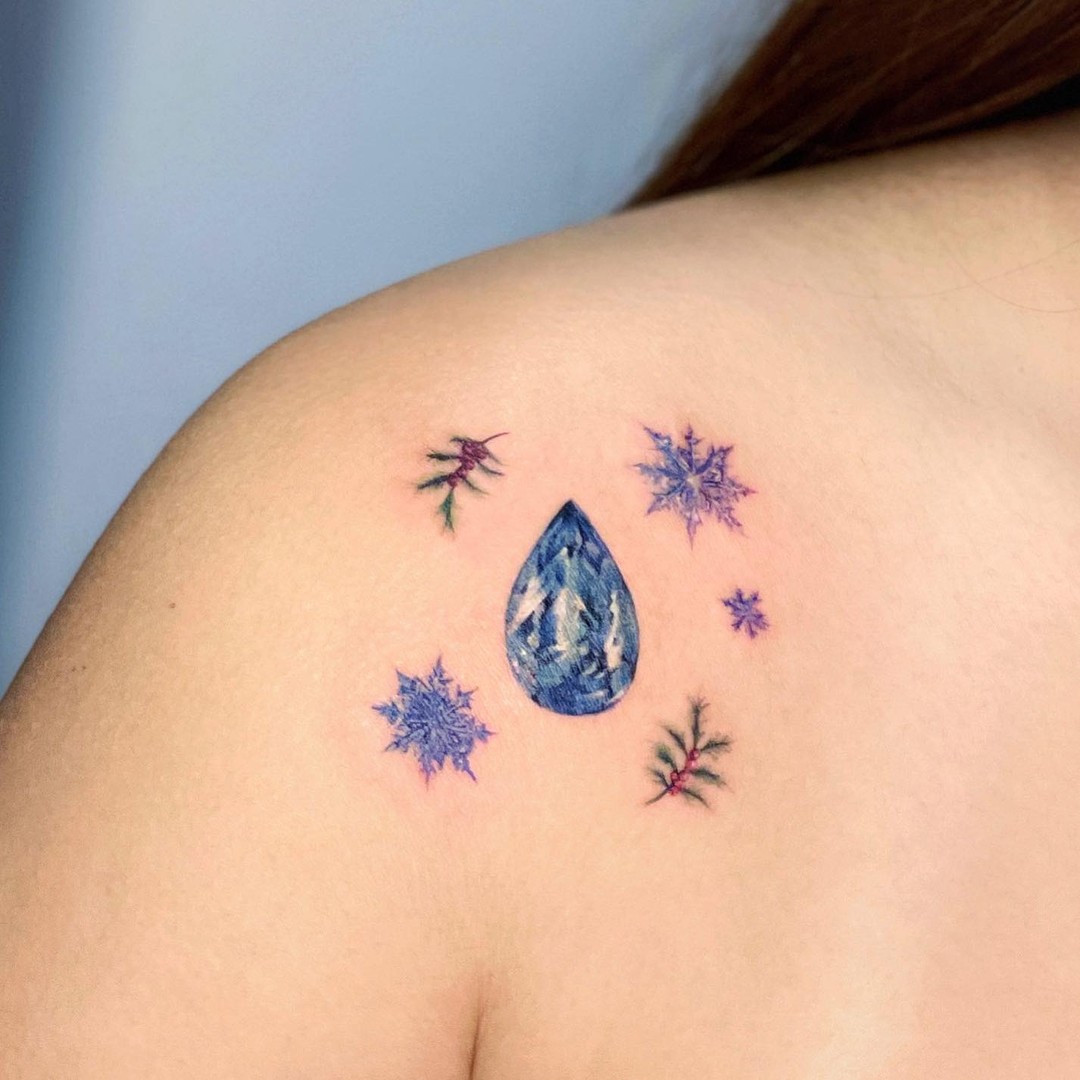 The tattoo features a striking blue water droplet surrounded by delicate snowflake designs in various shades of purple.