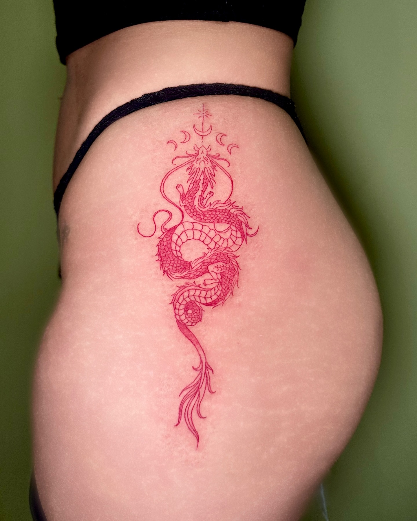 The striking red dragon tattoo features delicate scales and flowing lines that create a sense of movement and grace.