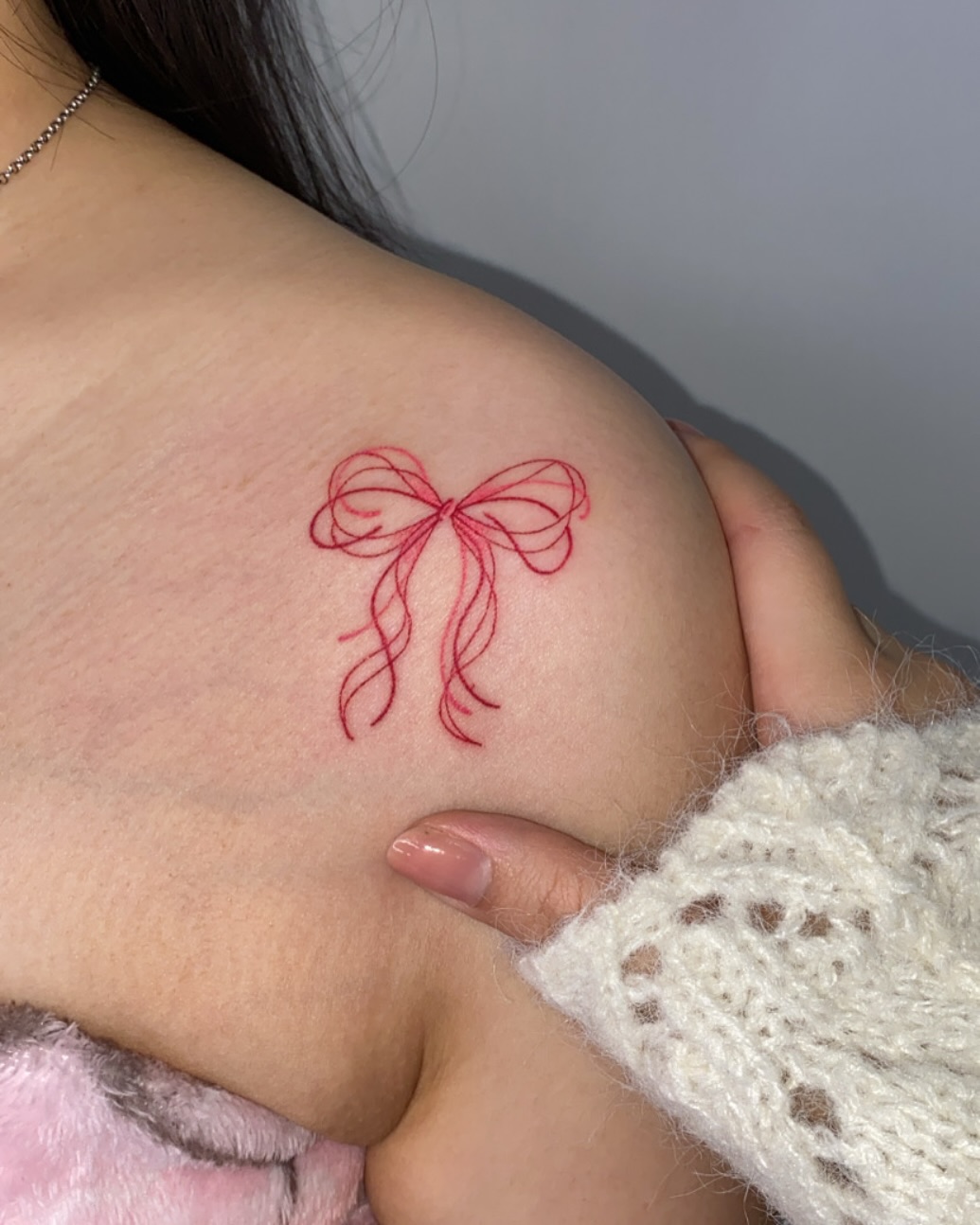 The tattoo features a finely detailed red bow with delicate flowing ribbons that enhance its playful appearance.