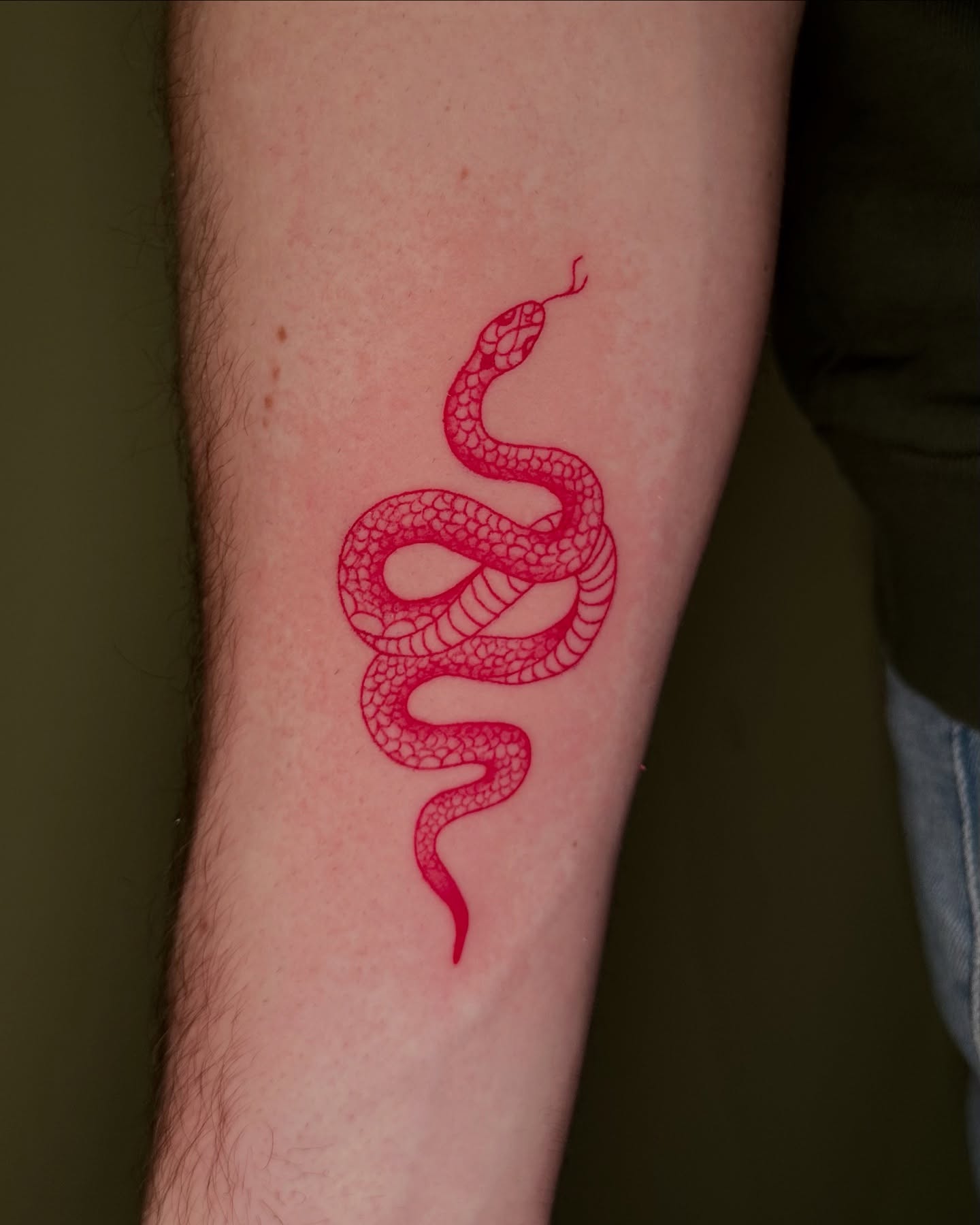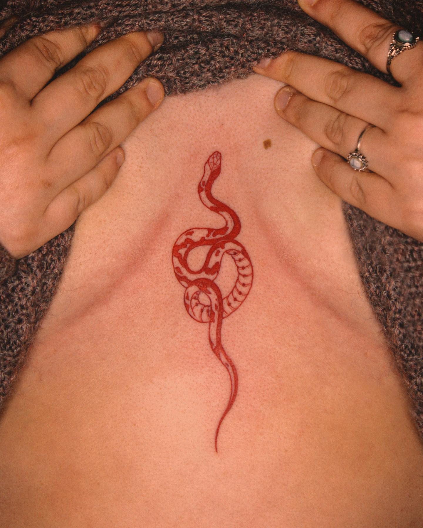 The tattoo features a coiled snake rendered in deep red ink, showcasing smooth lines and intricate detailing.