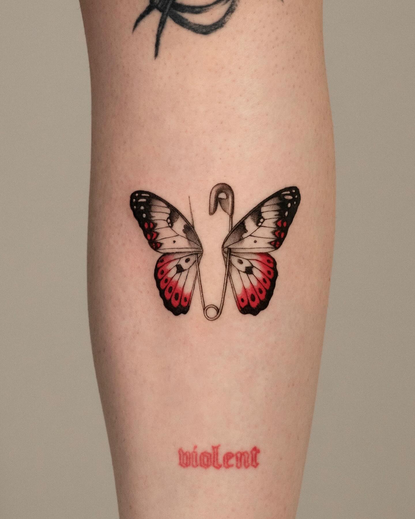 The tattoo features a butterfly with striking red and black wings, expertly positioned around a safety pin at its center.