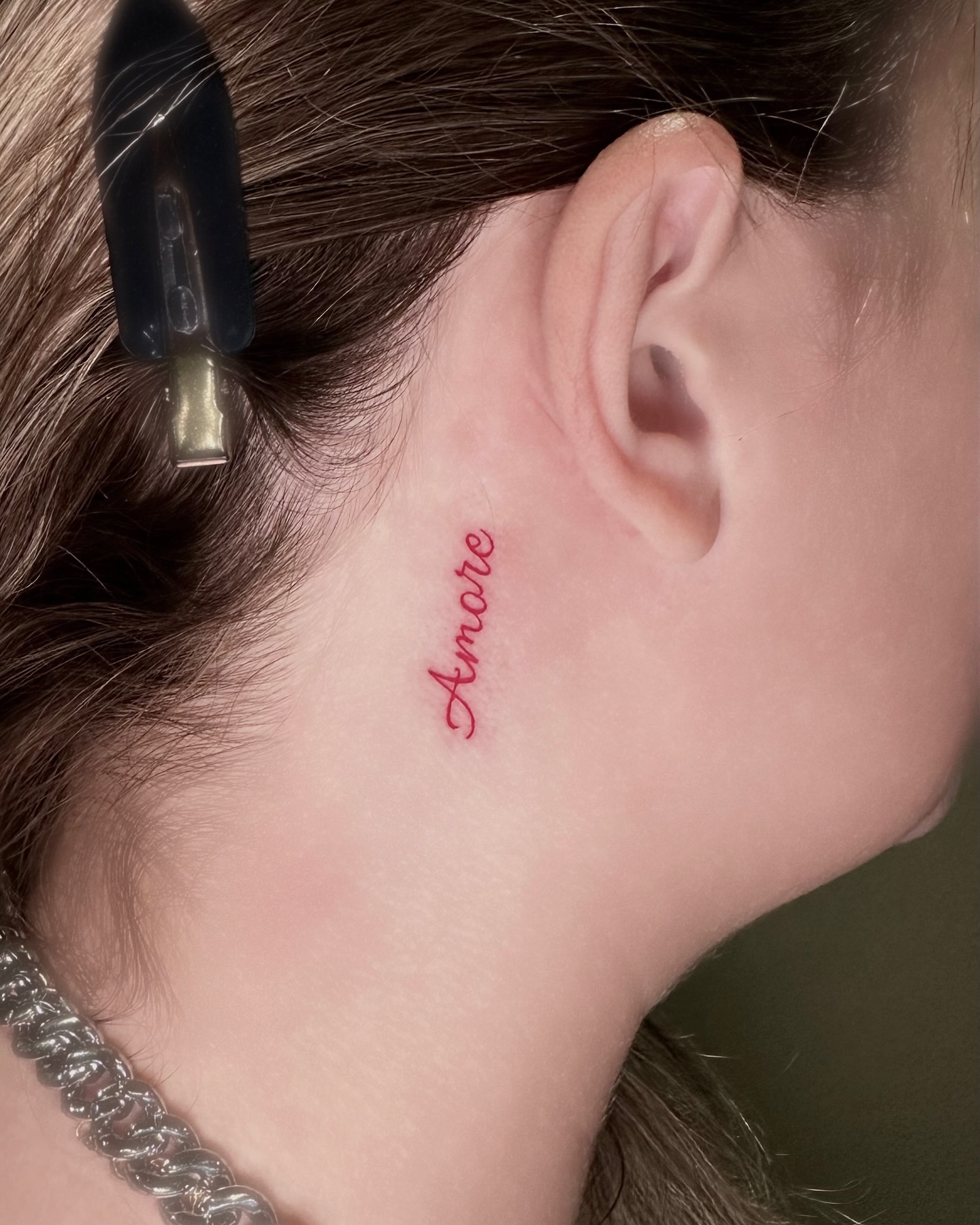 The elegant script of the word “Amore” in red ink stands out against the soft skin just behind the ear.