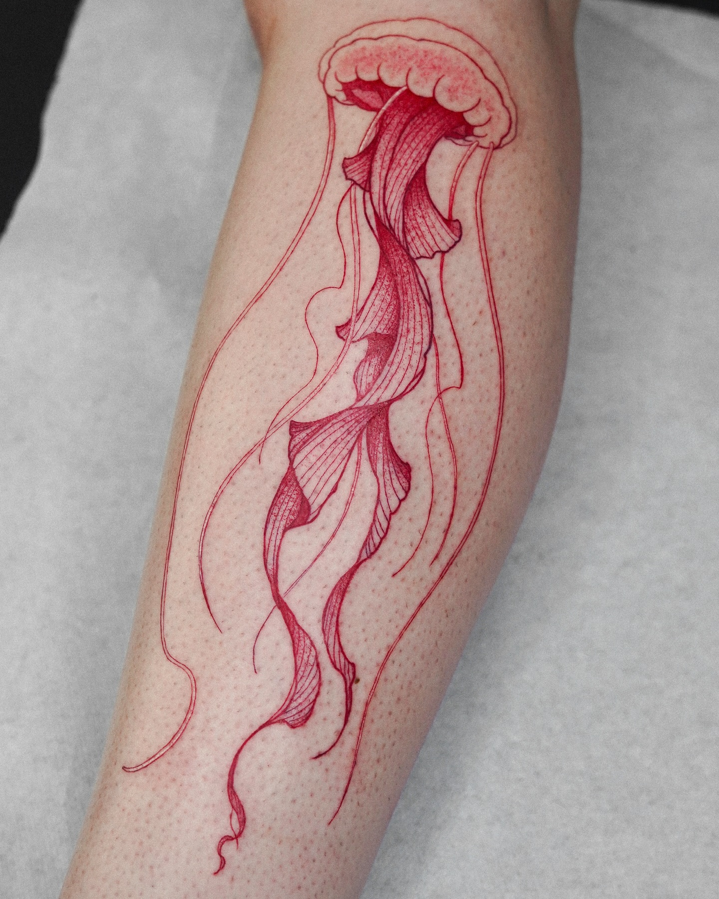 The tattoo features a detailed jellyfish rendered entirely in red ink, showcasing its flowing tentacles and bell shape.