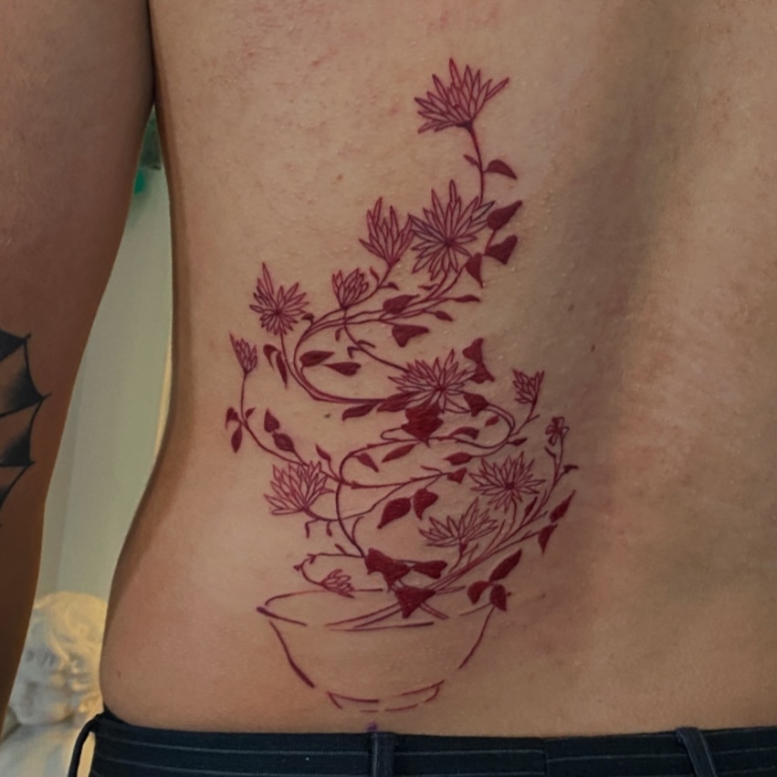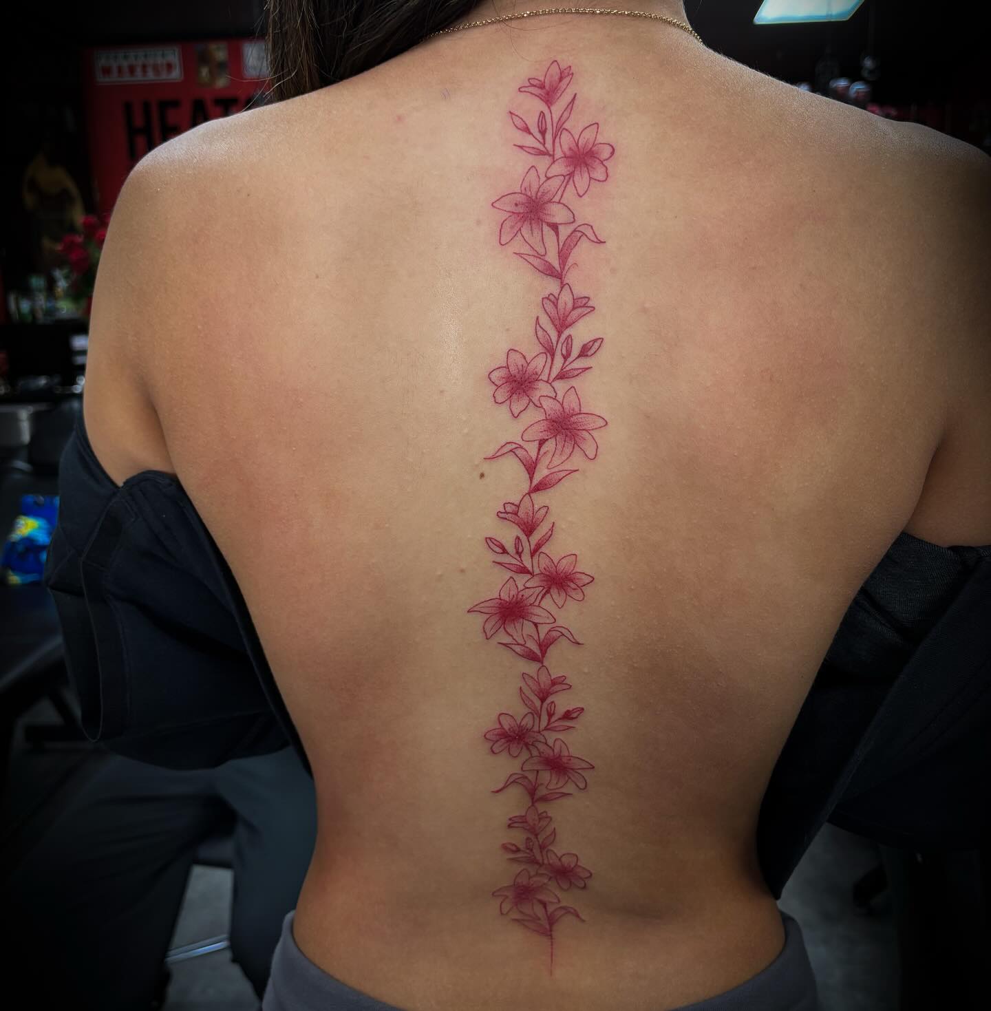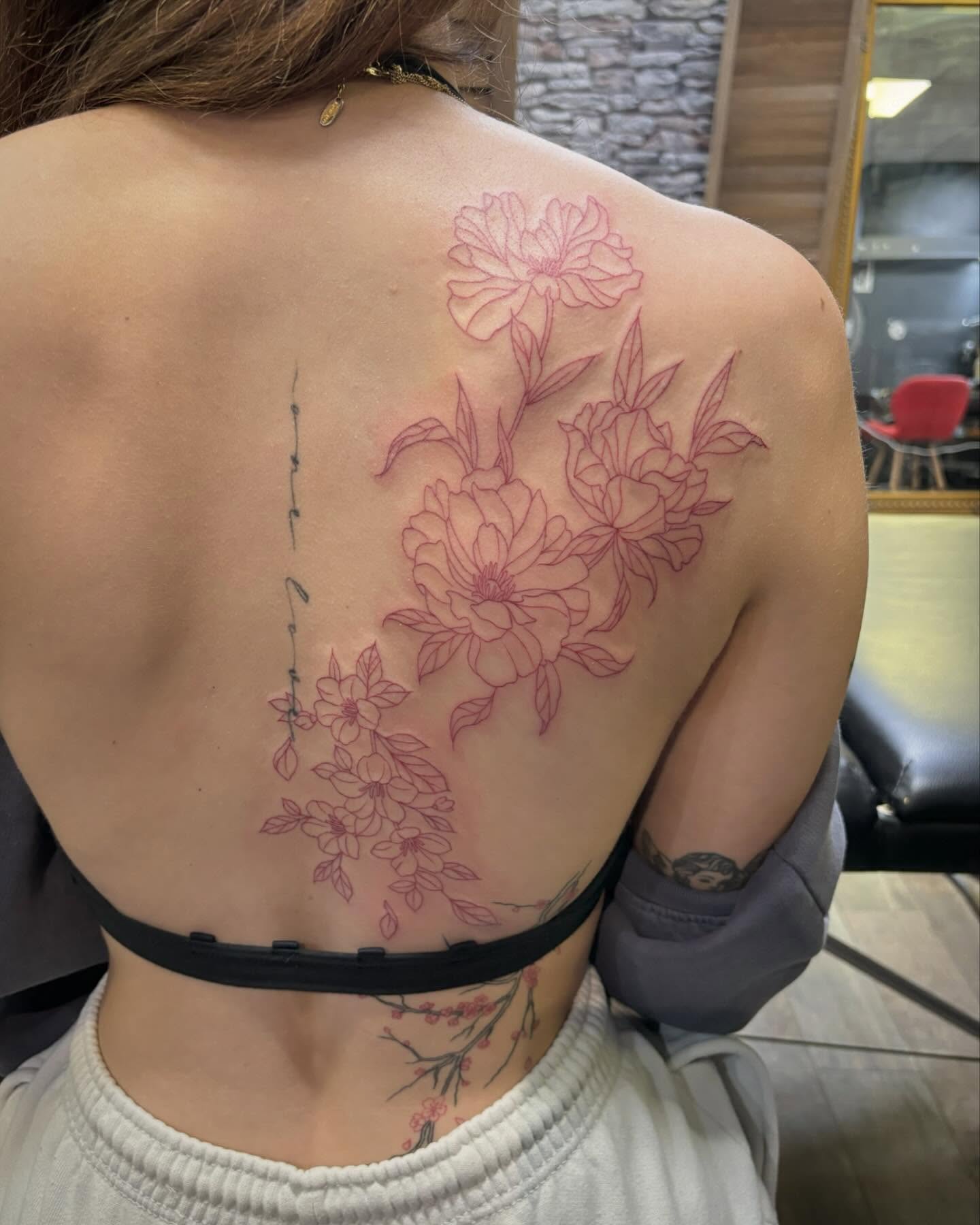A delicate line of flowers runs gracefully down the center of the back, showcasing a soft red ink that adds a subtle touch.