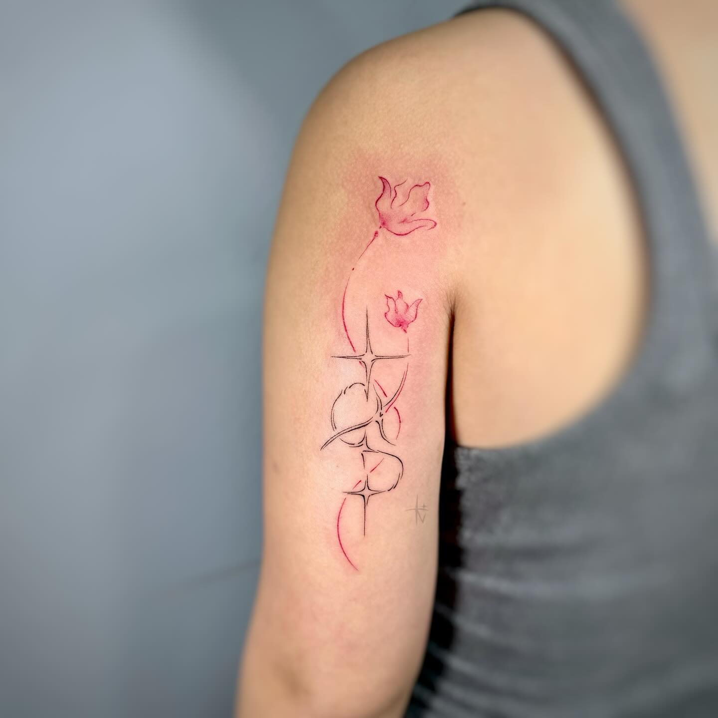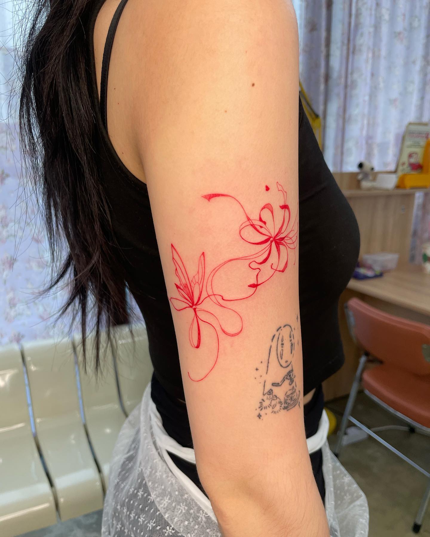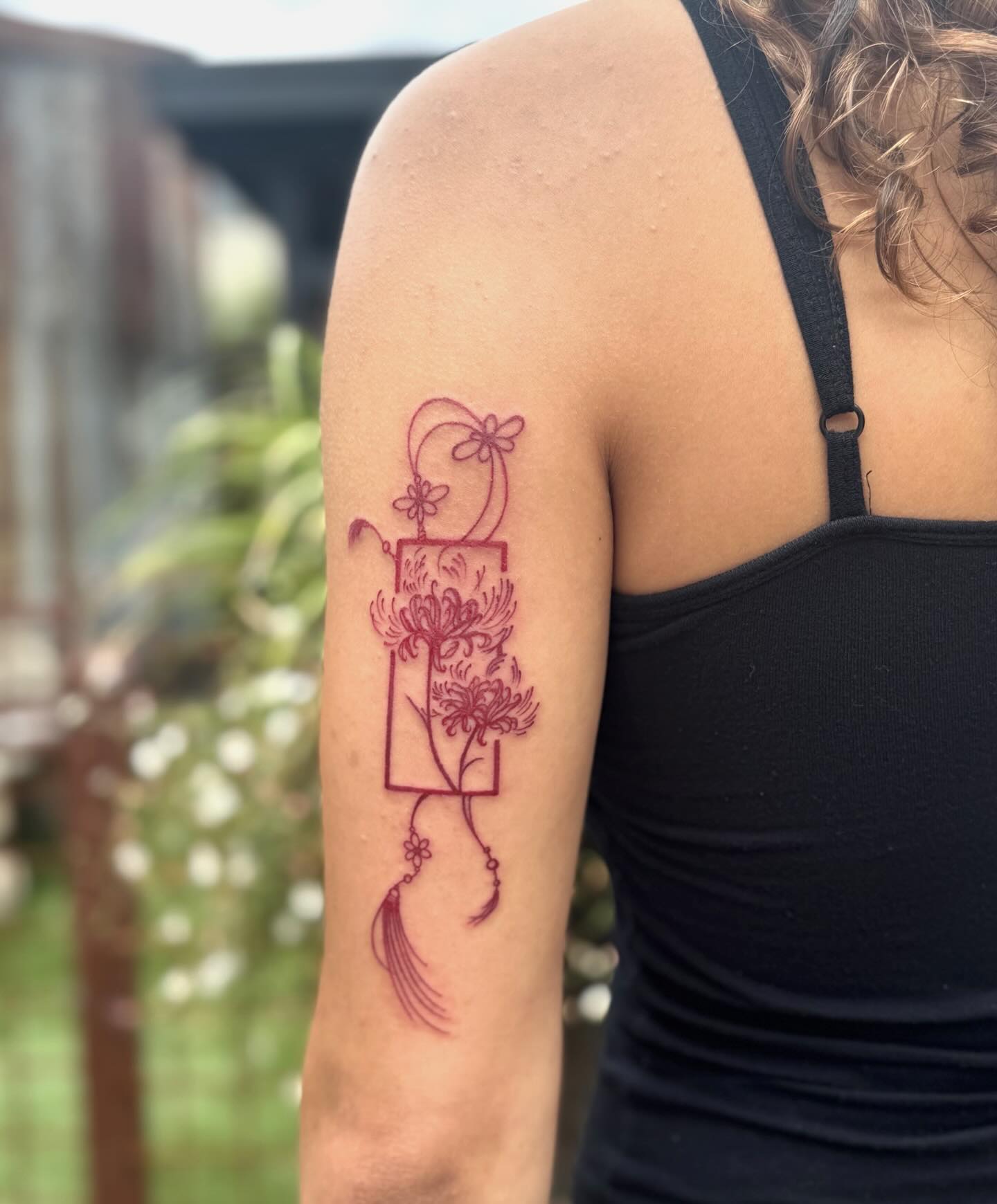 The tattoo features a delicate red ink design that includes floral elements alongside stylized characters.