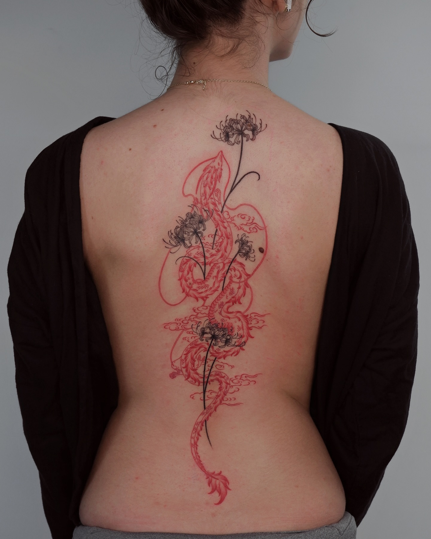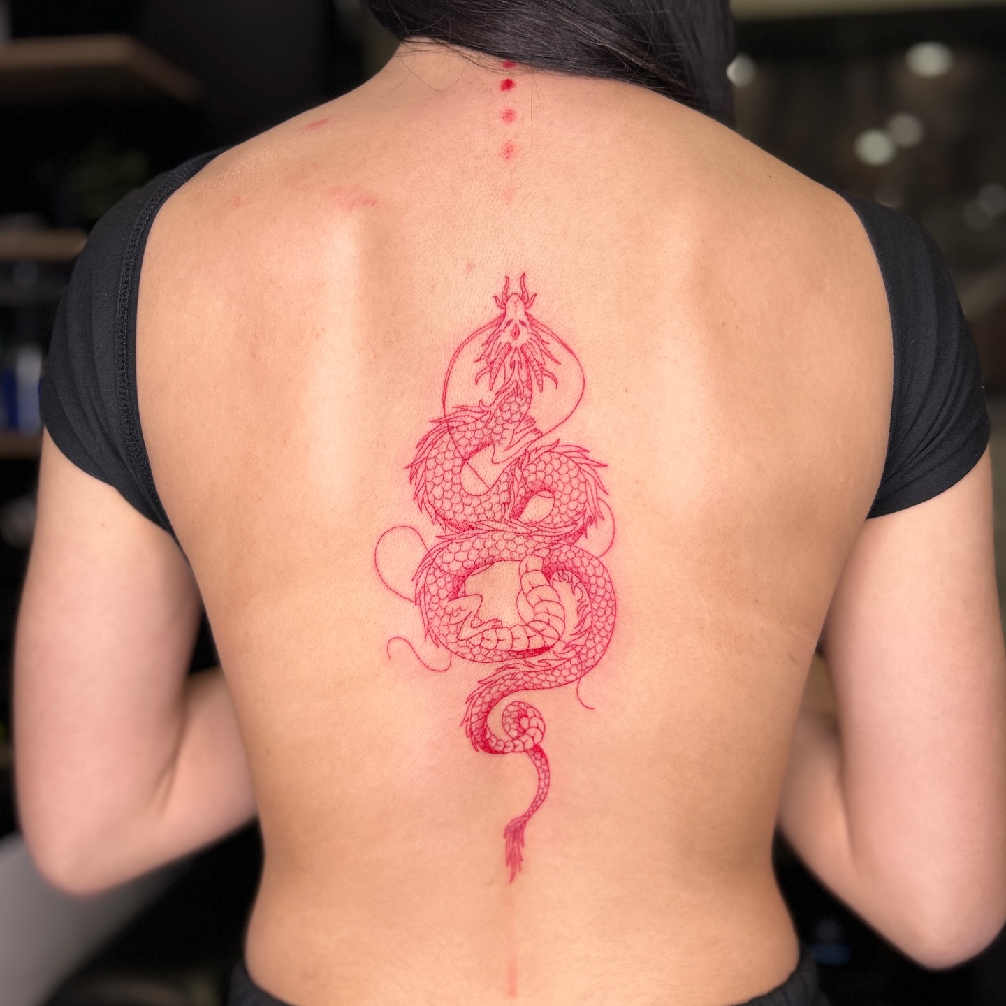 The intricate red dragon tattoo features a flowing design that wraps elegantly along the spine.