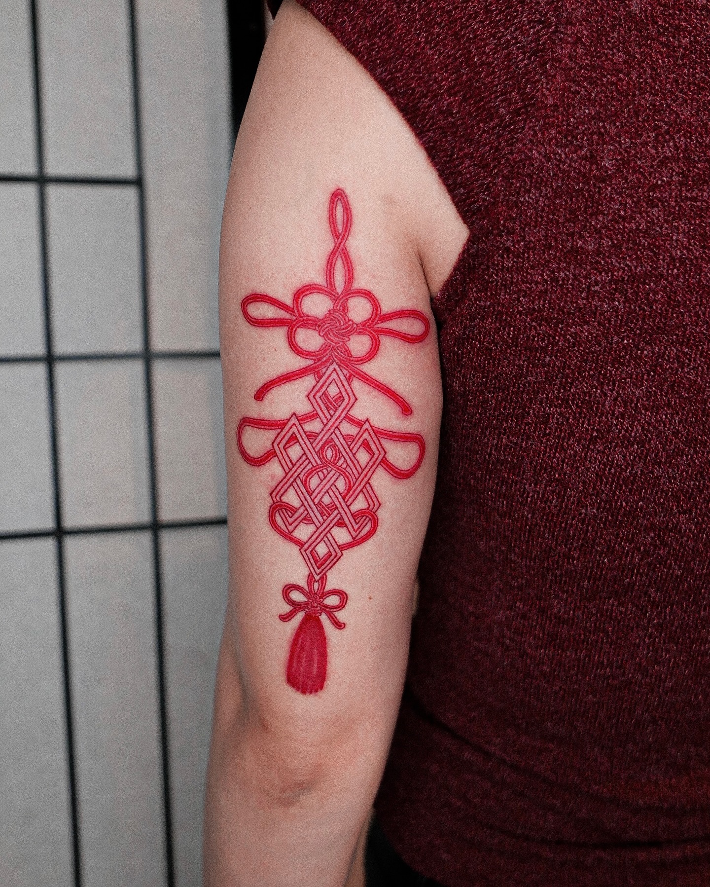 The tattoo features an intricate red knot design that draws attention with its symmetrical shapes and flowing lines.