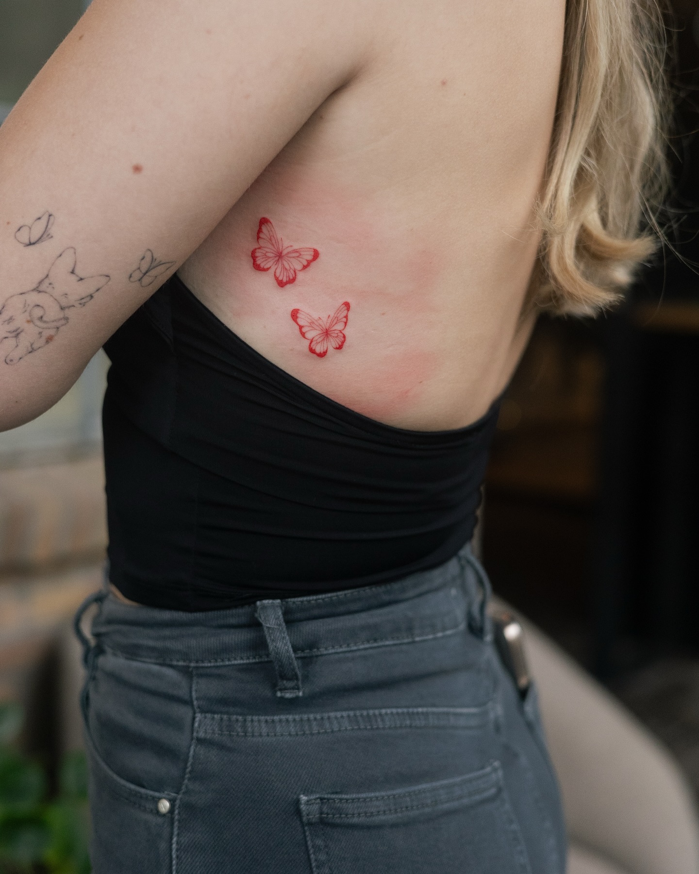 Three delicate red butterflies are inked just below the shoulder, creating a striking visual contrast against the skin.