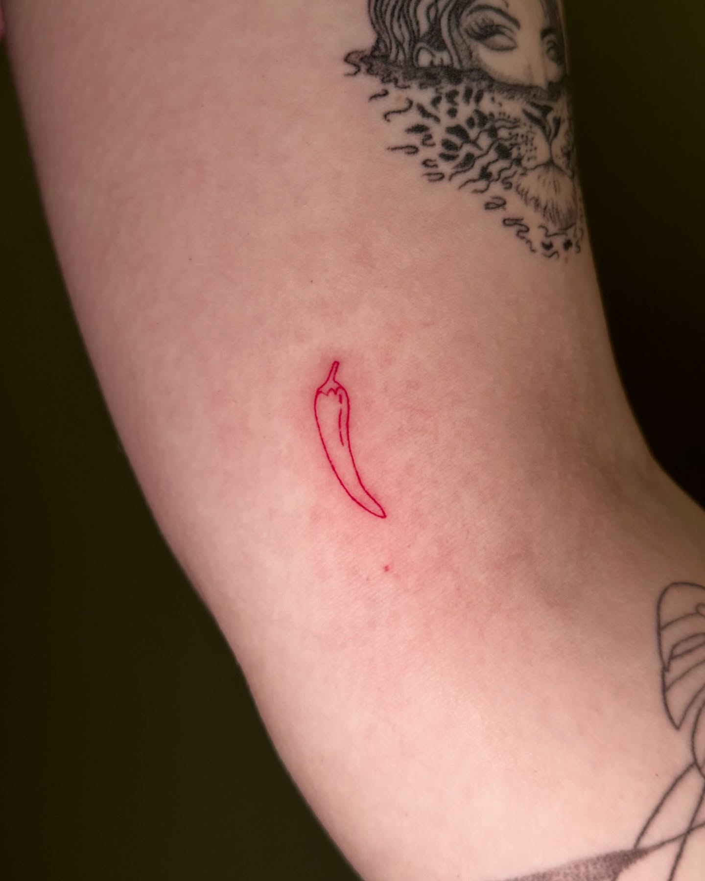 The tattoo’s precise outline and vibrant color create a striking visual appeal, emphasizing the shape and form of the pepper without additional details.